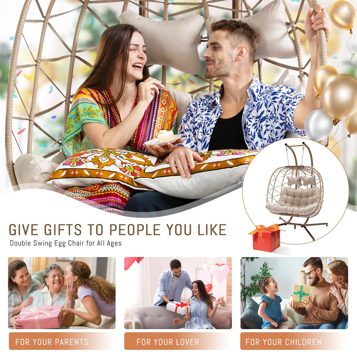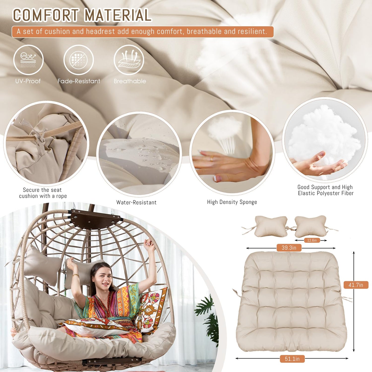 RADIATA Hanging Double Egg Chair with Stand, Oversized 2 Person Swing Egg Chairs Outdoor Indoor, 700Lbs Sturdy Loveseat Wicker Chair with Comfy Thick Cushion for Patio Backyard Balcony Porch, Beige