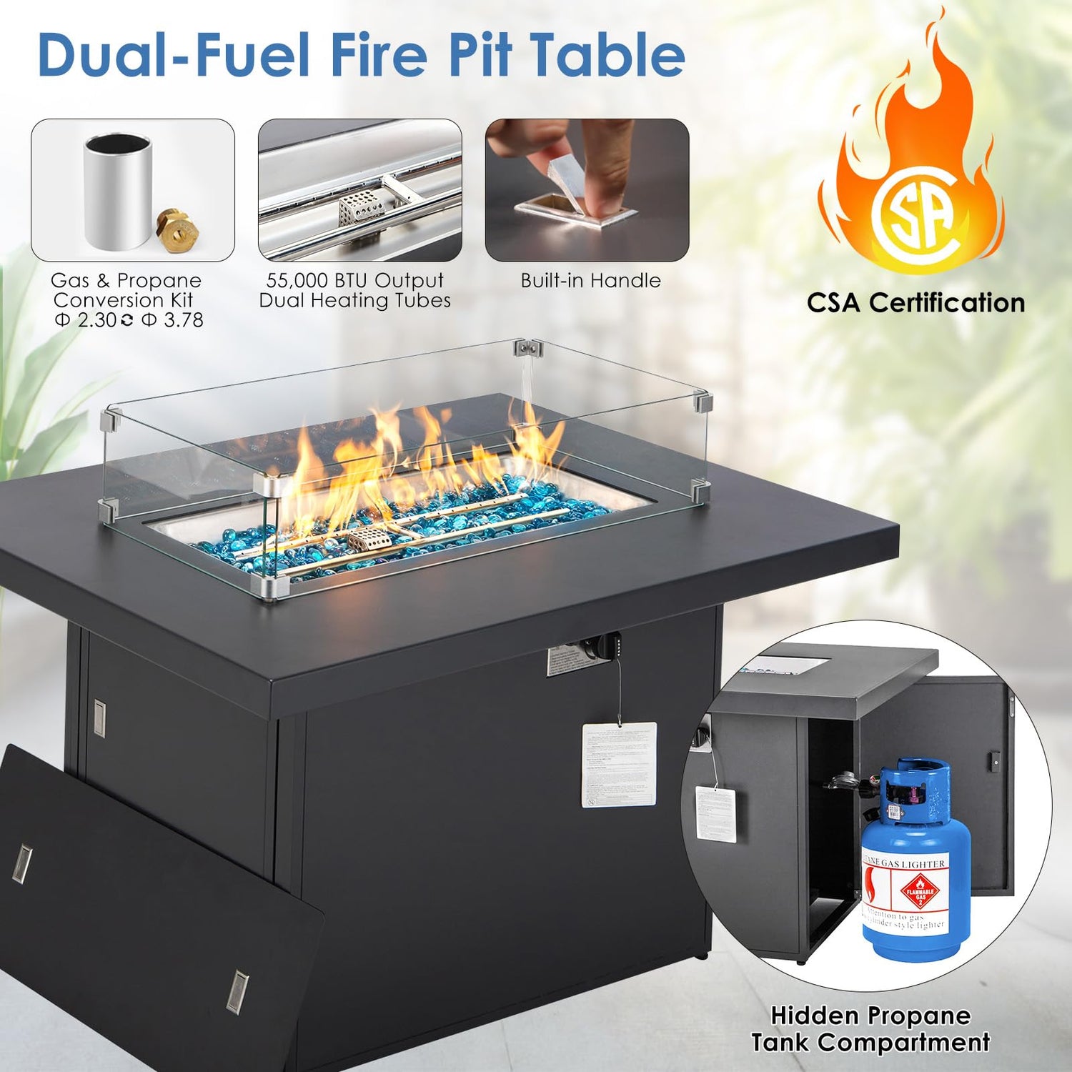 - Dual-Fuel Fire Table: CSA-certified aluminum fire pit table with dual burners delivers up to 60,000 BTU of heat, perfect for outdoor dining or evening gatherings; The built-in ignition and electronic flame control let you easily start and adjust the fire; An included 3.78mm natural gas conversion kit allows you to switch from propane to natural gas, giving flexible fuel options for your patio or backyard