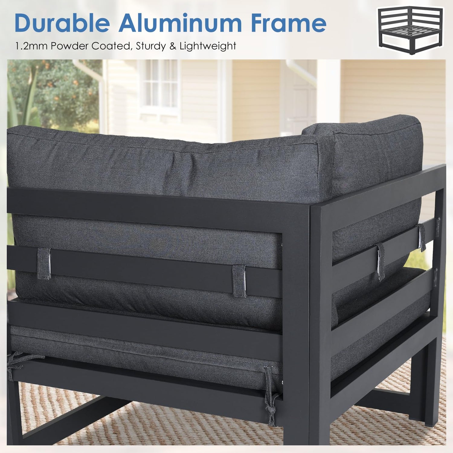 - Lasting Strength: Built with 1.2mm extruded aluminum tubing and precision welding, this aluminum outdoor sectional is made for durability; The sturdy frame supports up to 500 lbs, while a premium powder-coated finish adds rust-resistance and corrosion-resistance for long-term outdoor use; Despite its strength, the lightweight design lets one person easily move and rearrange pieces to refresh any patio, deck, or backyard setup