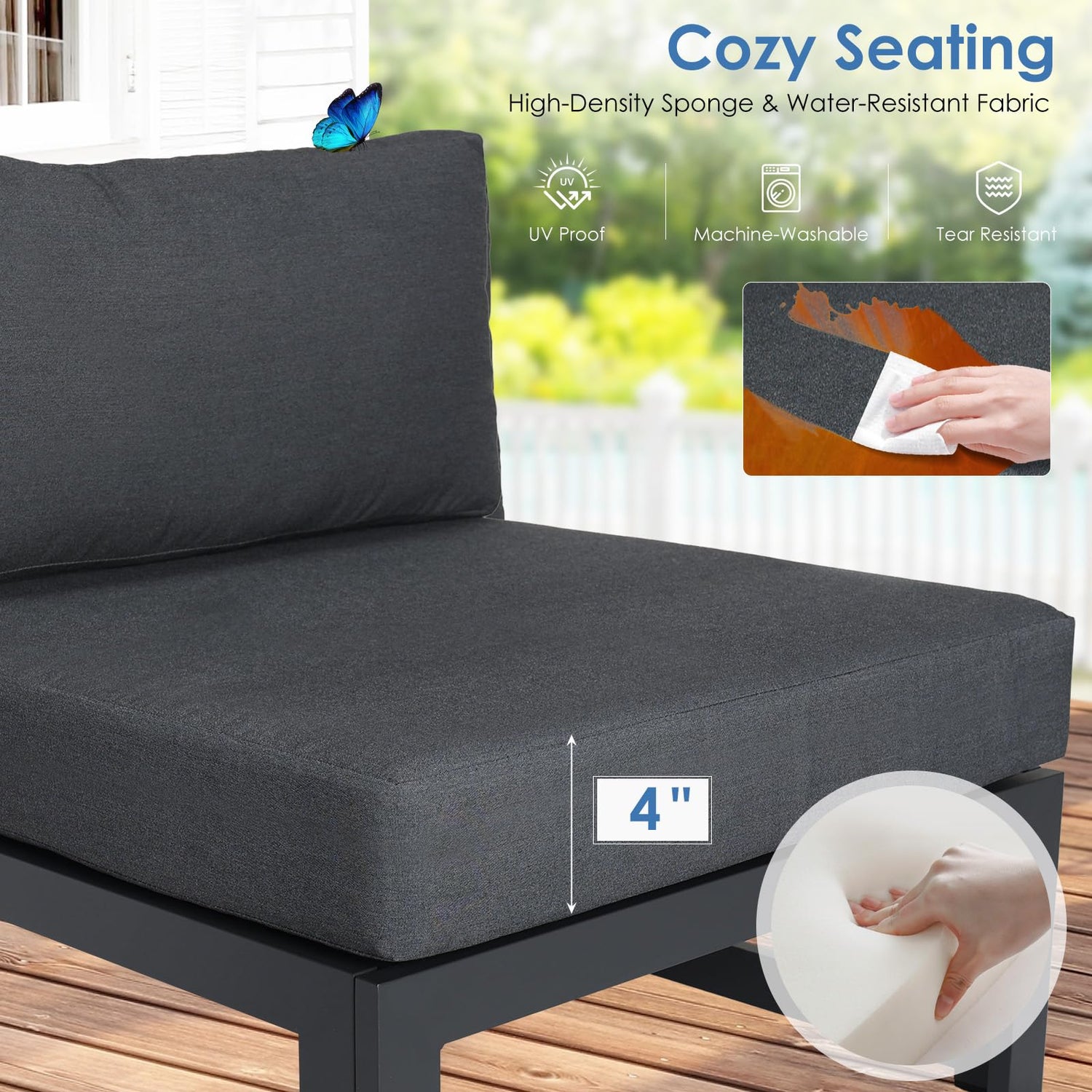 - Spacious Comfort: Designed with oversized seats measuring 29" wide by 29" deep, this aluminum outdoor sofa provides ample space to stretch out and relax; The 4.1" thick, three-layer memory foam cushions deliver lasting support that resists sagging or flattening, even with everyday use; For easy care, the removable cushion covers are machine-washable, keeping your patio or backyard lounge area fresh and inviting