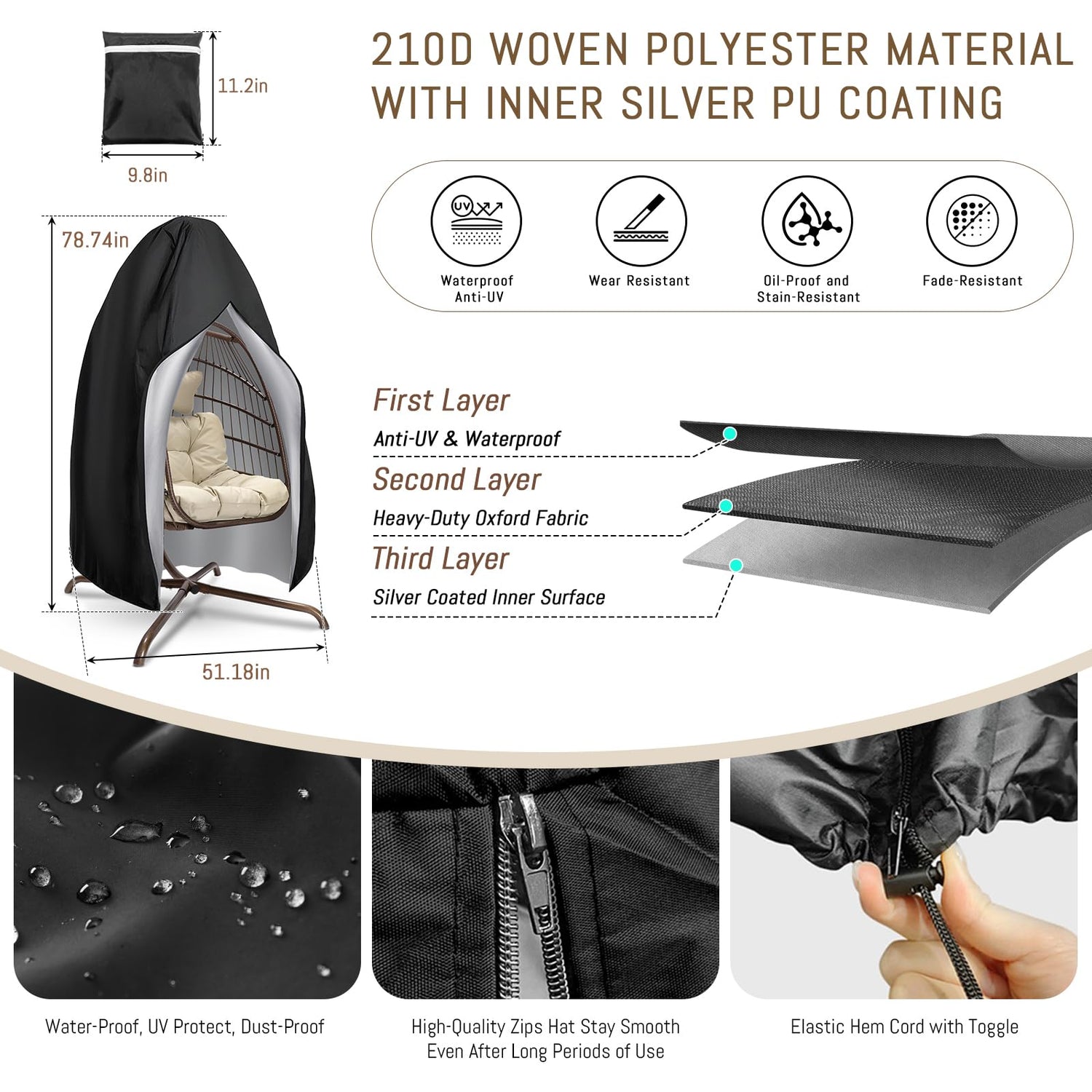 - Swing Chair Cover: 210D woven polyester material with inner Silver PU coating, which is water-proof, UV Protect, dust-proof, Our swing chair cover owns an extra UV repellant coating in the inner-layer,with Ultraviolet-proof grade up to 50+,Waterproof & Durable