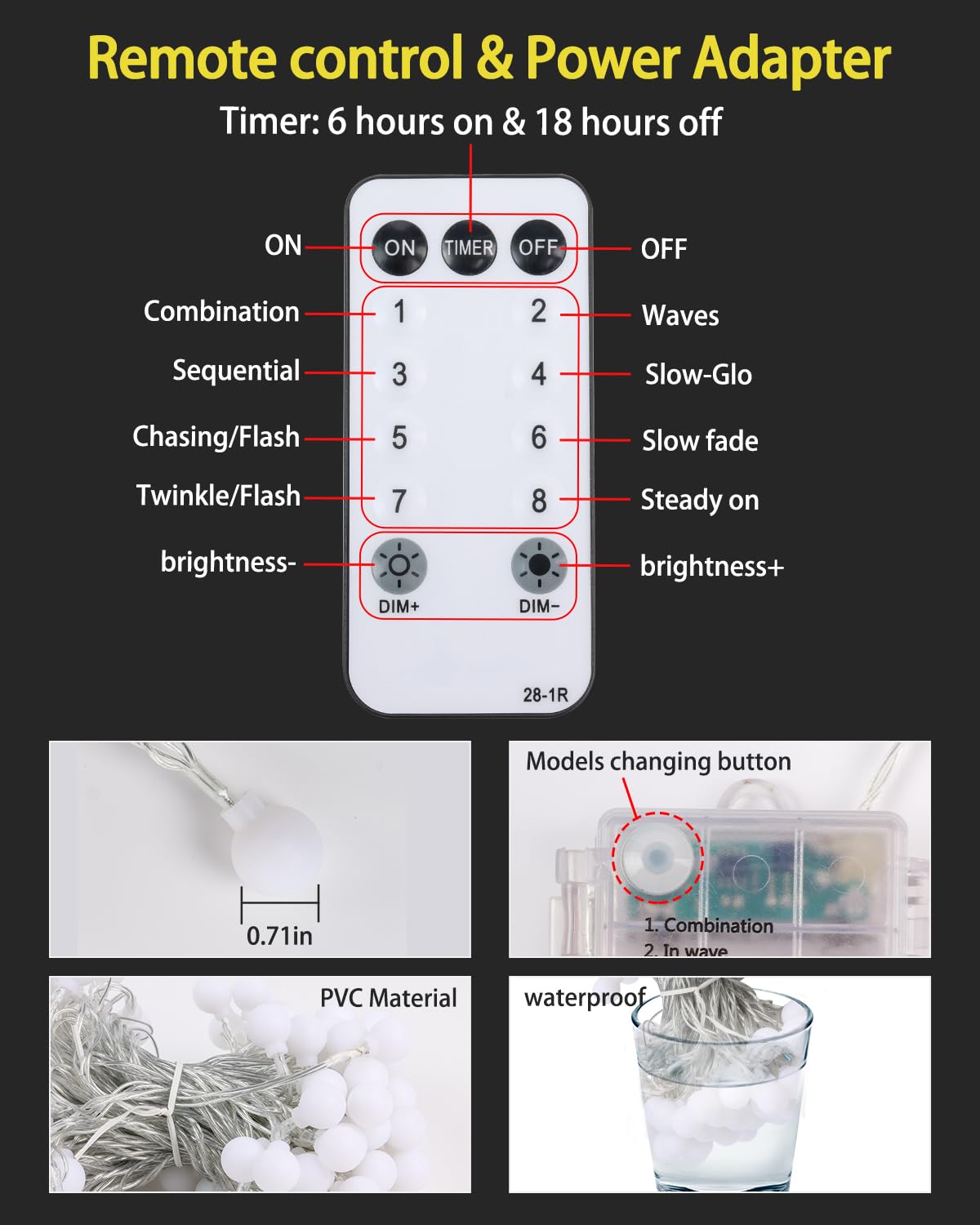 - Remote/Press Control & Timer: String Lights have 8 modes, namely combination, in waves, sequential, slo-glo, chasing/flash, slow fade, twinkle/flash, steady on. Once Timer is turned on, it can be turned on for 6 hours on and 18 hours off. These functions can be controlled by remote or by Press the button on the cell box. String lights adjust the brightness using the remote.