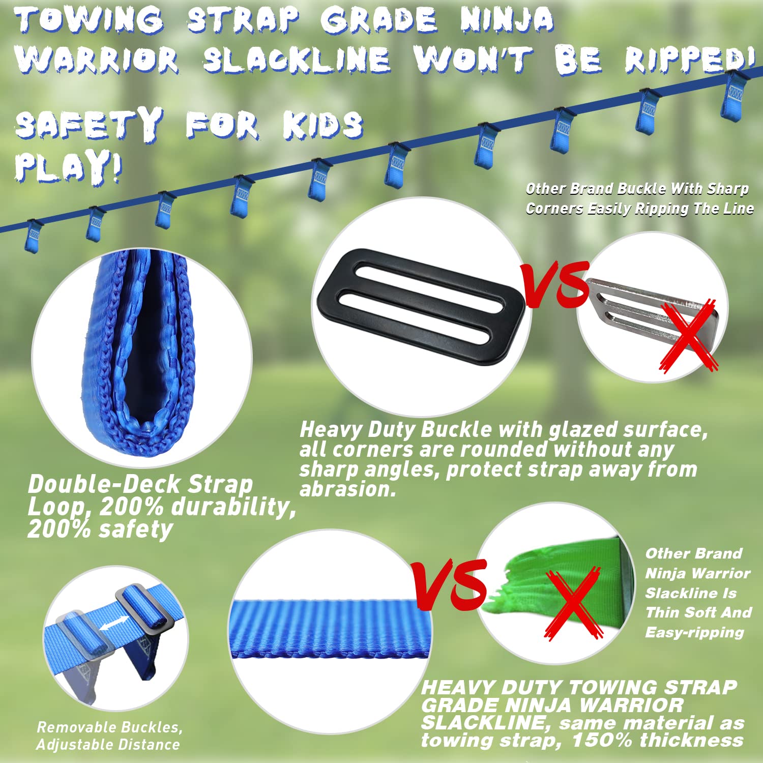 - [Upgraded Strength] - Upgraded Version Ninja Warrior Slackline. It's excellent safe ninja rope for kids outdoor play. Made of towing strap material, 150% thickness of regular slacklines, ensuring excellent firmness for long time use. Nothing is more important than that kids play in safety