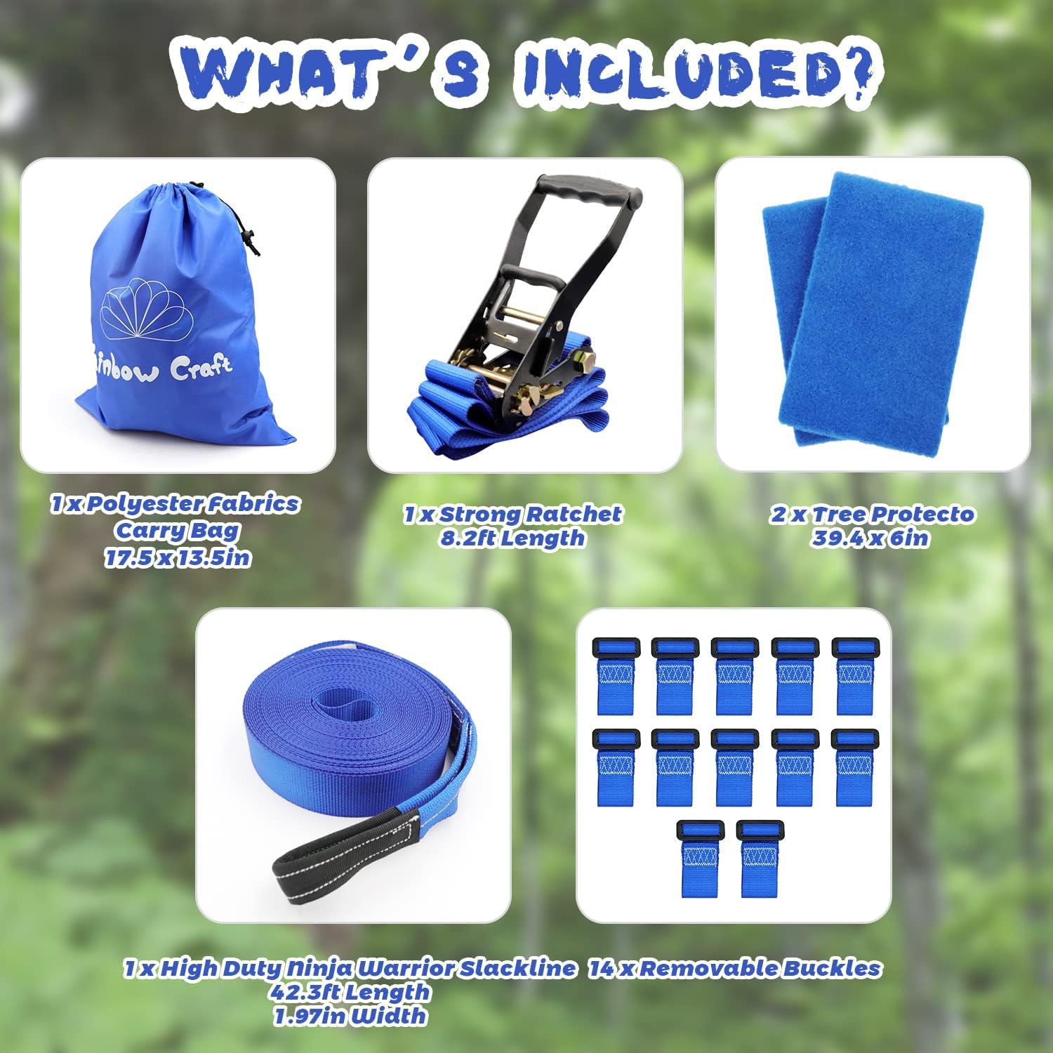 - [Customized Your Ninja Warrior Obstacle Course]– 12pc Removable Loops Buckle are to be attached for more ninja obstacle accessories. Matching with Rainbow Craft ninja ladder, climbing rope ladders, monkey bars, ninja rings, ninja wheel, climbing rope, cargo climbing net, ninja fists, etc. The zipline set includes durable 42ft x 20in slackline, 8ft strong ratchet with rubberized grip, 12pc removable buckles, 2pc 39.4 x 6in tree protector and a 17.5 x 13.5in polyester fabrics carry bag.