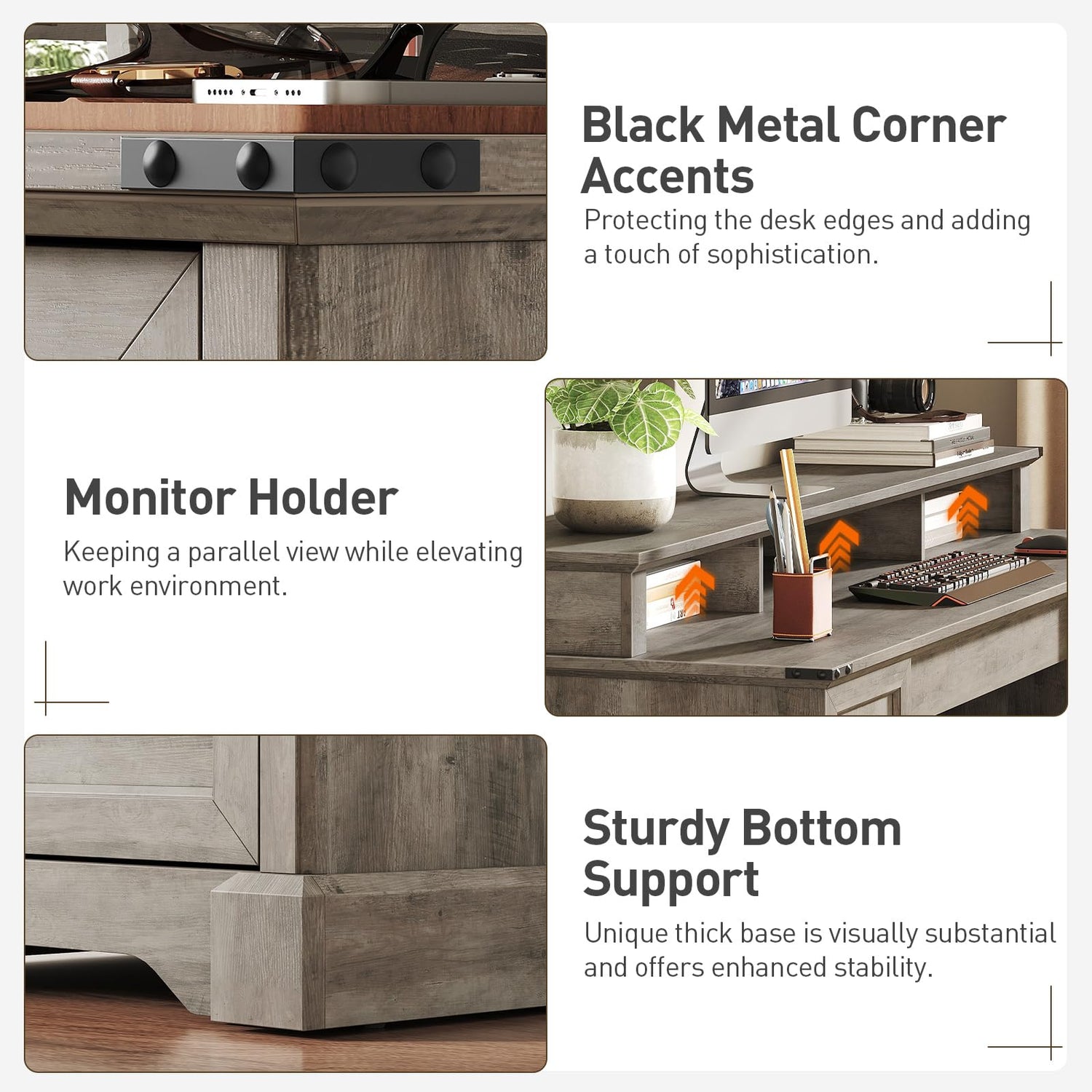 - Monitor Stand Design: The farmhouse computer desk provides a 55"L x 21.7"W expansive top surface, suitable for various office supplies. The accompanying monitor stand ensures correct posture and eye-level positioning, increasing work comfort