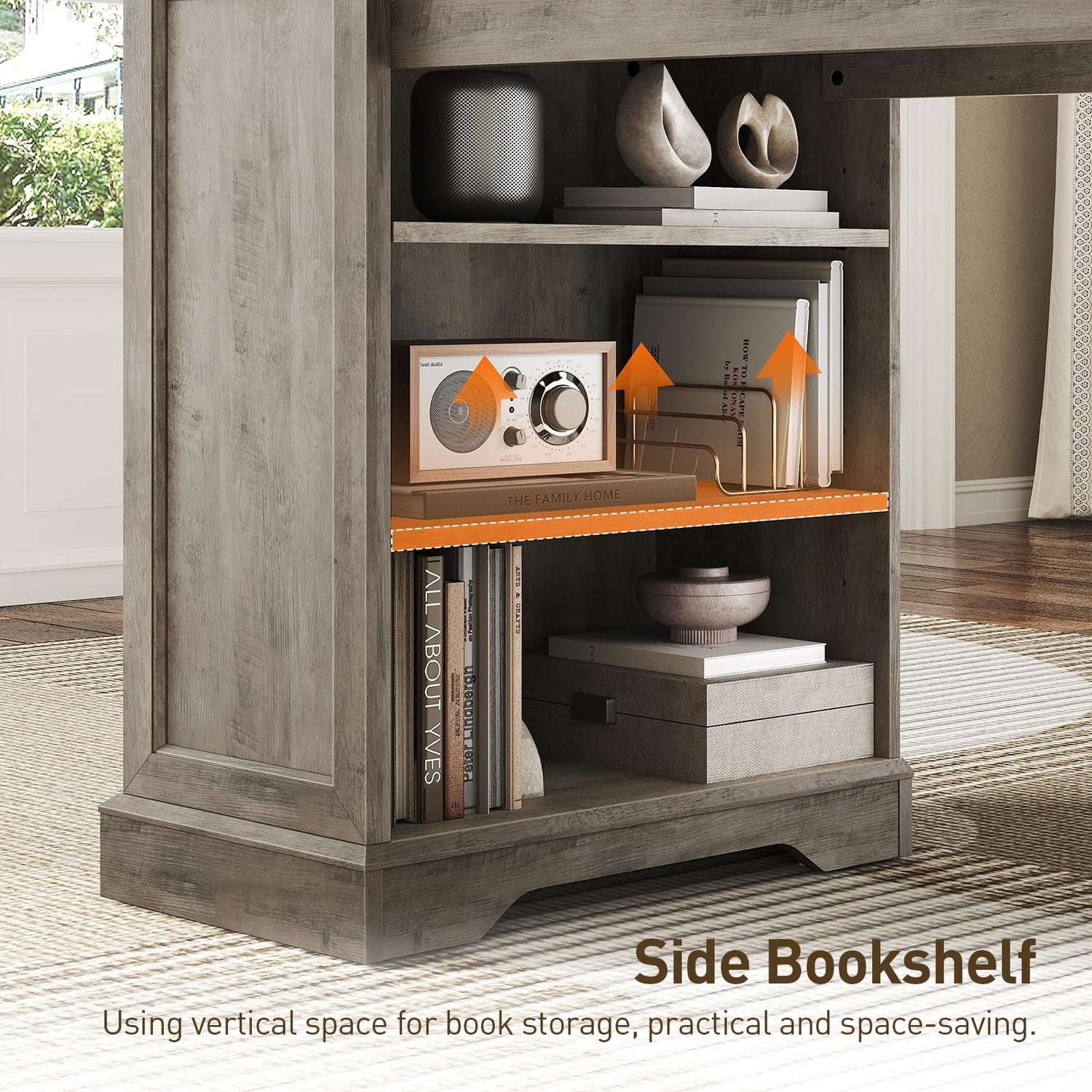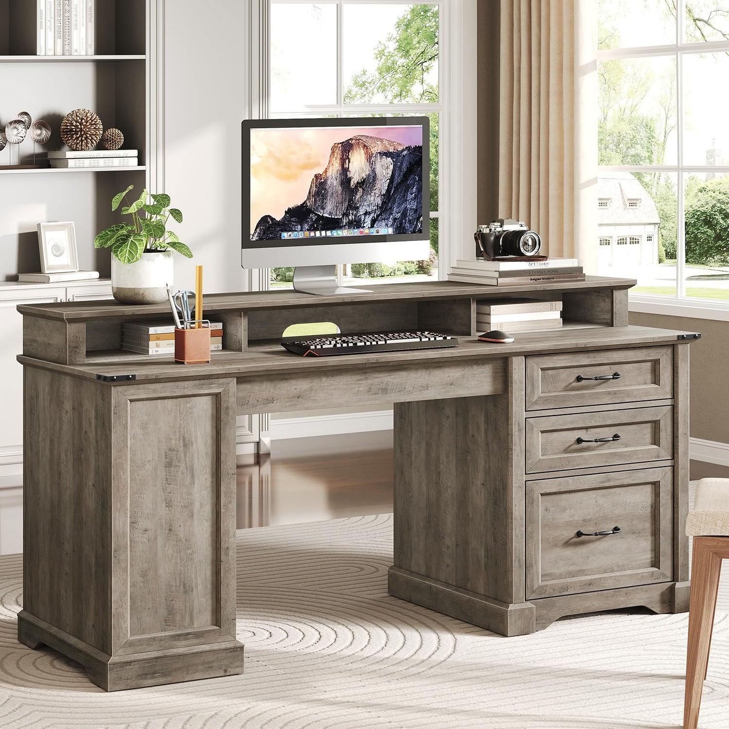 RALGEND 55'' Farmhouse Executive Desk with Drawers, Home Office Desk with File Cabinet and Storage Shelf, Charging Station, Computer Desk with Monitor Stand, Writing Gaming Desk, Greige