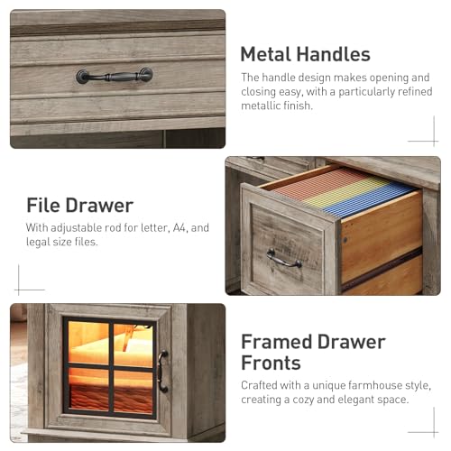 RALGEND 58" Farmhouse Executive Desk, Farmhouse Computer Desk with Drawers & File Cabinet, Wooden Home Office Desk with Power Outlet & LED Light, Workspace for Study Writing, Greige