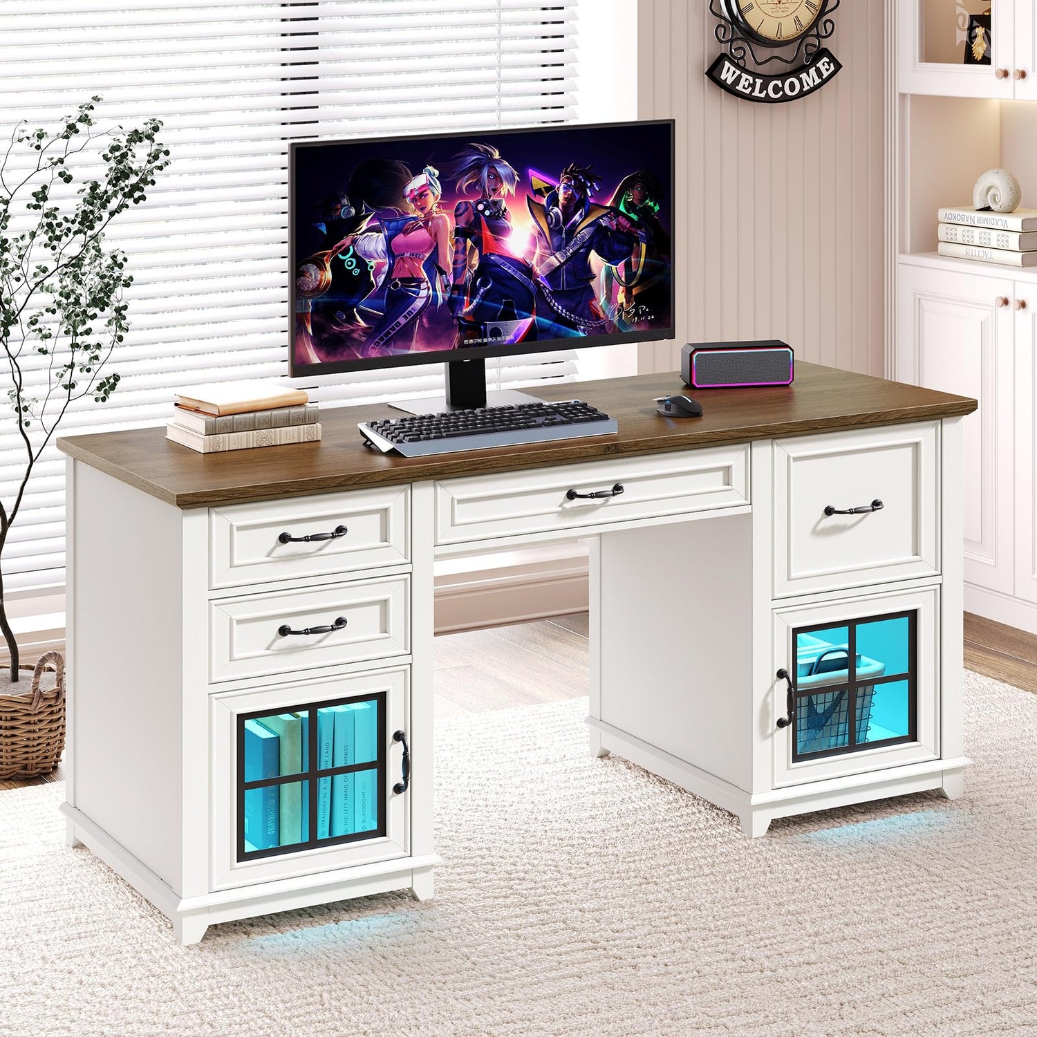 RALGEND 58" Farmhouse Executive Desk with Drawers, Wooden Home Office Desk with Power Outlet & LED Light, Computer Desk with File Drawer and Cabinet, Workspace for Study, White and Walnut