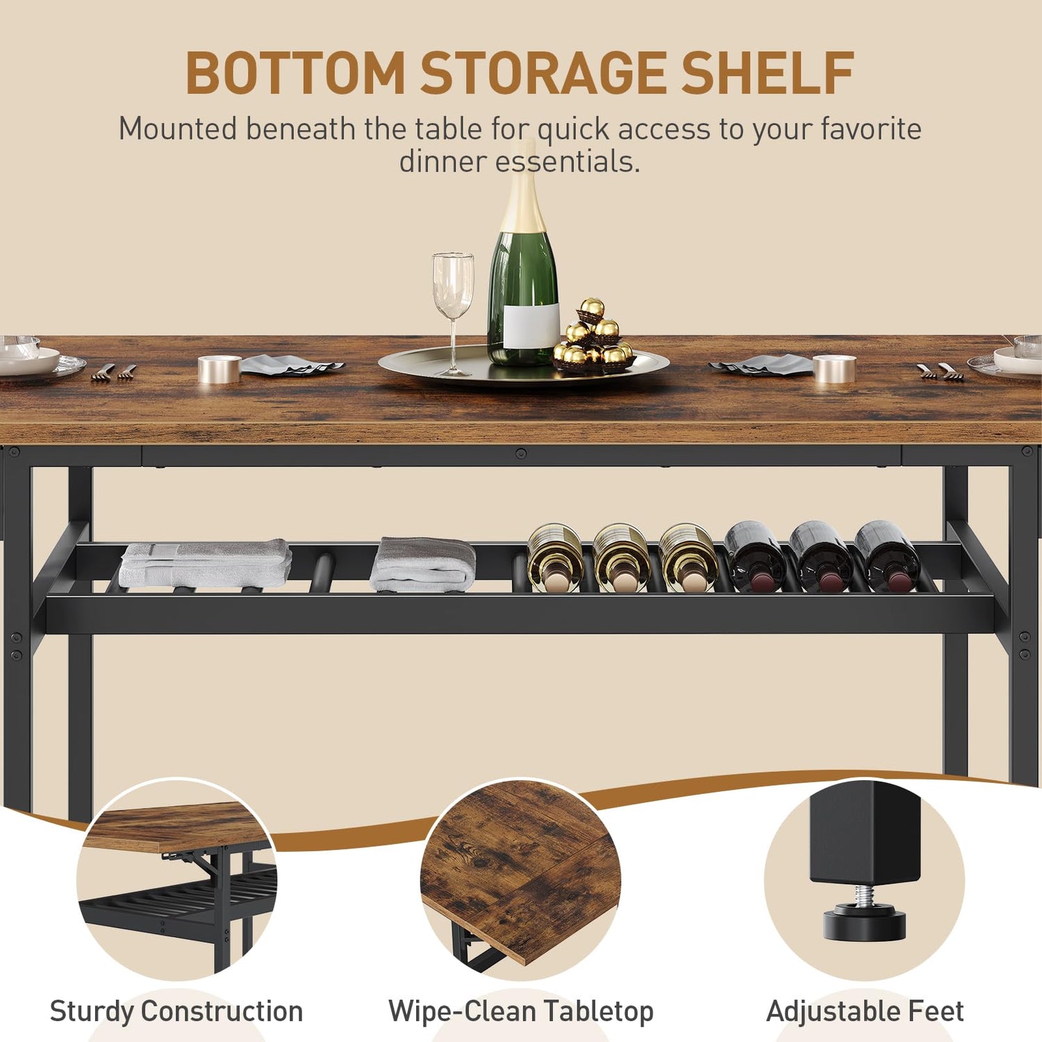- Ergonomic Design: Each dining chair features an arched backrest that conforms to the spine curve for comfortable support. The backrest panel has grooves for easy movement. The table boasts a wine rack under the top that can store up to 14 bottles