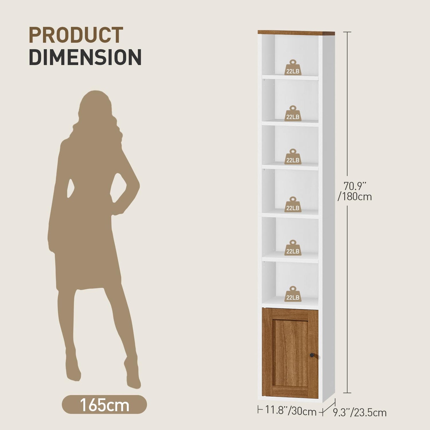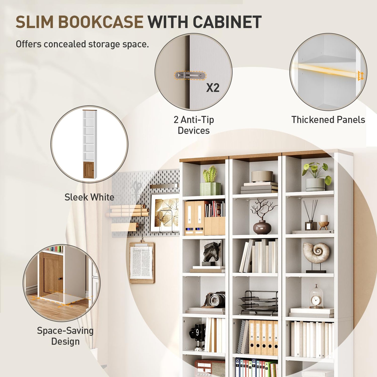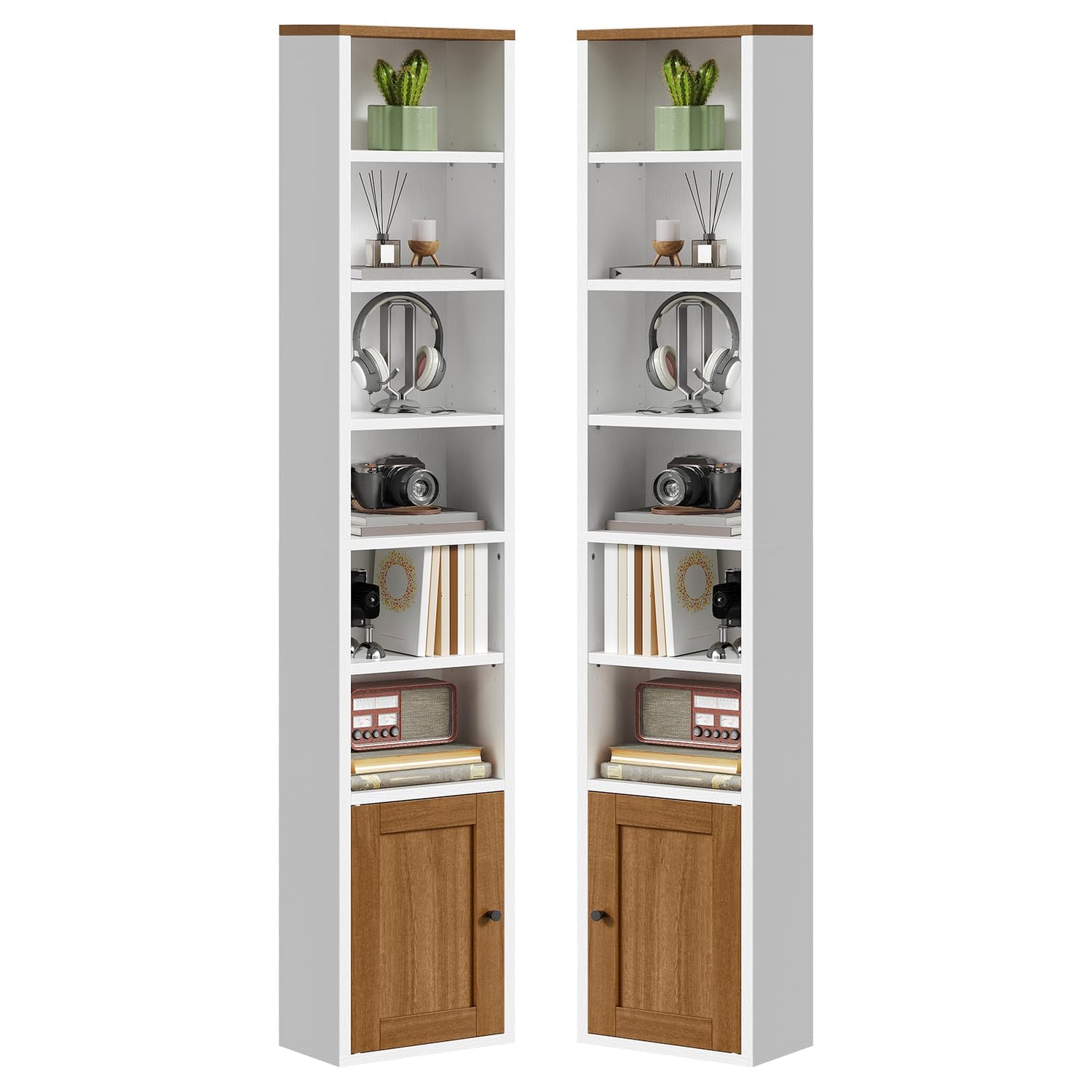 RALGEND 7-Tier Tall Narrow Bookshelf with Door Set of 2, 71 Inches CD DVD Slim Media Tower Rack with Storage Cabinet, Adjustable Shelves, Skinny Display Bookcase for Home Office, White and Walnut