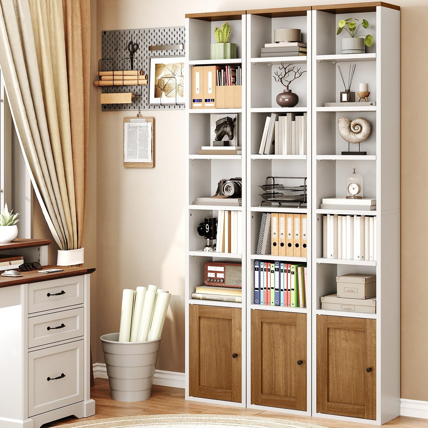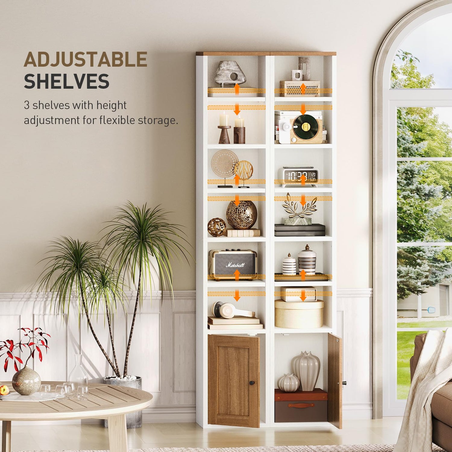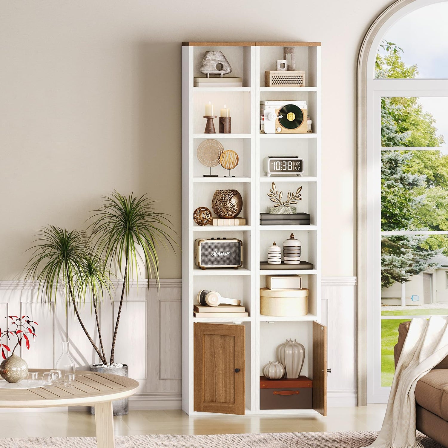 RALGEND 7-Tier Tall Narrow Bookshelf with Door Set of 2, 71 Inches CD DVD Slim Media Tower Rack with Storage Cabinet, Adjustable Shelves, Skinny Display Bookcase for Home Office, White and Walnut