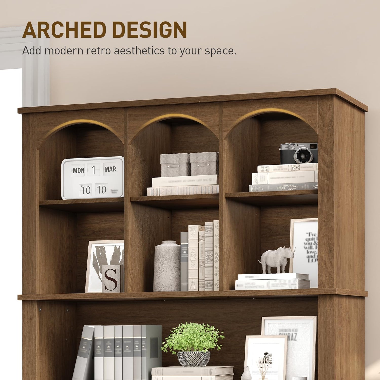 RALGEND 73.2" Tall Farmhouse Arched Bookshelf with Drawer and Door, 6 Tier Mid Century Modern Book Shelf and Bookcase with Storage, Floor Standing Display Cabinet for Living Room, Home Office, Walnut