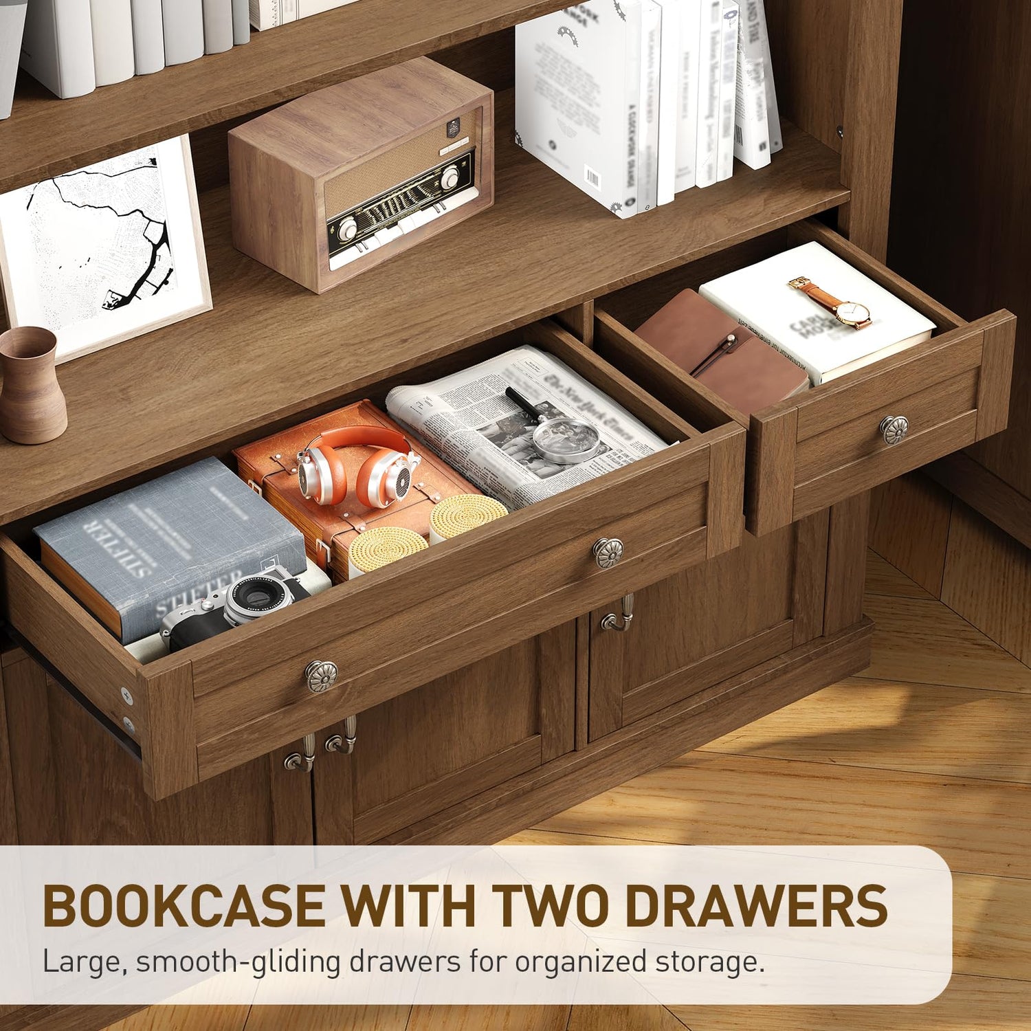 - Versatile Use: Finished in a minimalist walnut, this bookshelf with drawers and doors seamlessly adapts to home offices, bedrooms, living rooms, and kitchens. More than a bookcase, it's a display stand or kitchen storage solution that elevates any decor, from farmhouse to modern