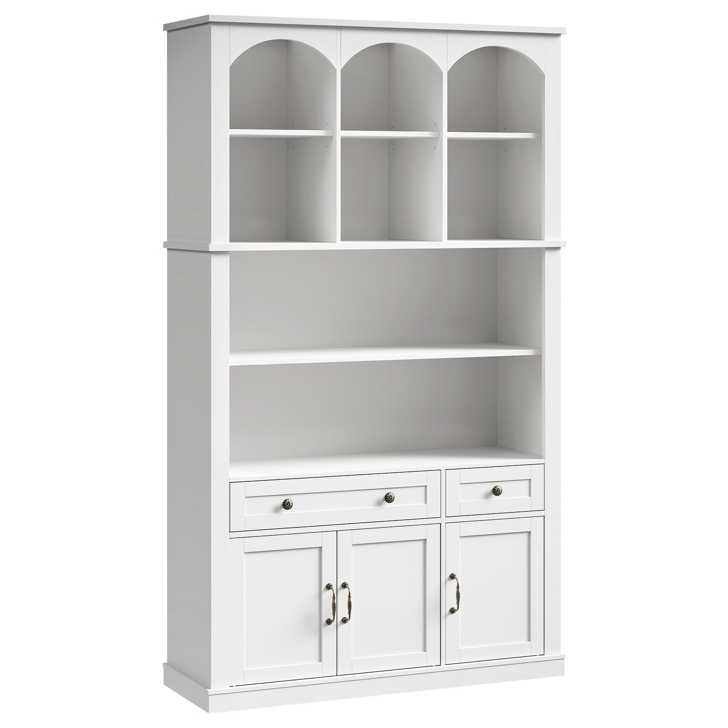 RALGEND 73.2" Tall Farmhouse Arched Bookshelf with Drawer and Door, 6 Tier Mid Century Modern Book Shelf and Bookcase with Storage, Floor Standing Display Cabinet for Living Room, Home Office, White