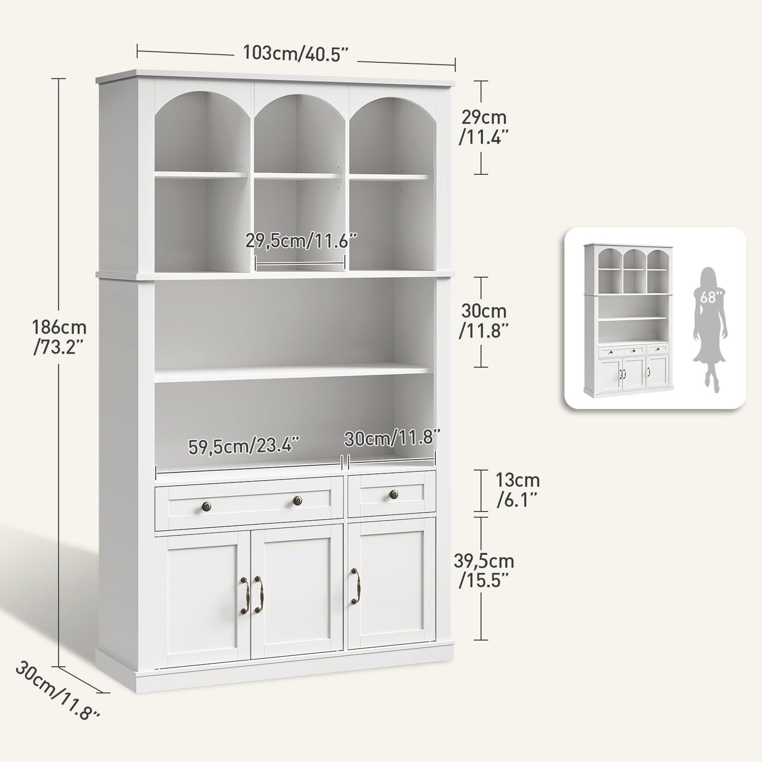 - Spacious Design: Measuring 40.5"L x 11.8"W x 73.2"H, this 6-Tier arched bookshelf includes 6 open cubbies in the upper section for showcasing items and 2 smooth wooden drawers with metal handles, alongside 2 concealed cabinets below, providing ample storage solutions for your needs