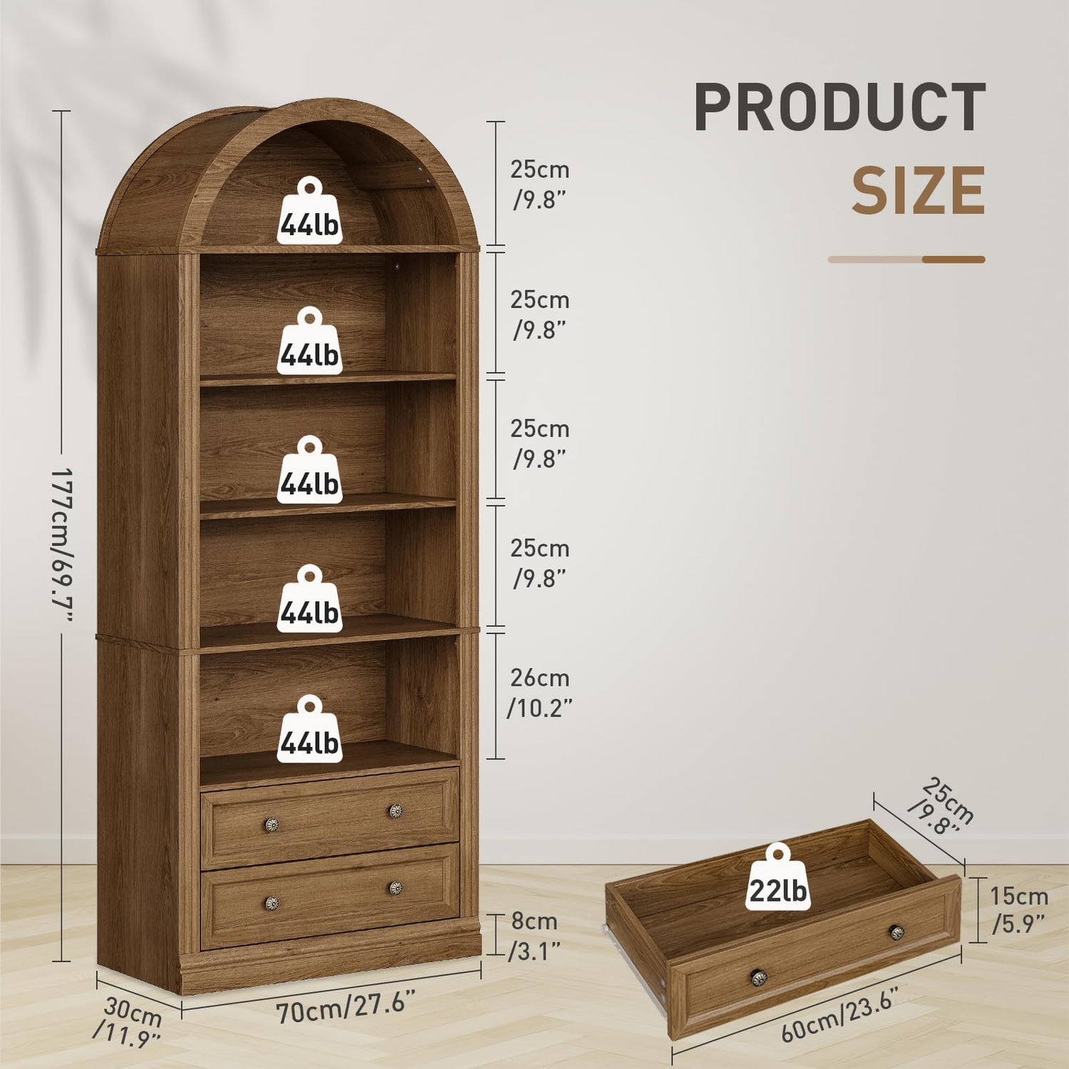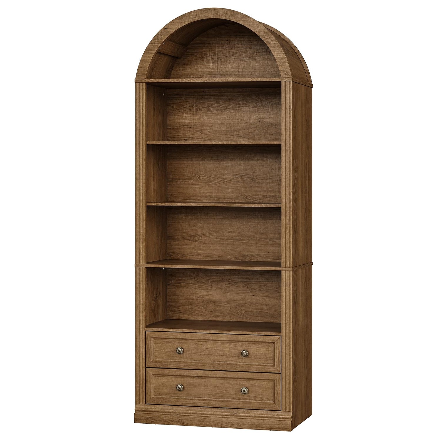 - Generous Storage Capacity: The farmhouse arched bookcase, sized at 27.6”L x 11.9”W x 69.7”H, offers 5 spacious open shelves for displaying books, decorations, and treasures, plus 2 large drawers with full-extension metal ball-bearing glides for easy hidden storage access