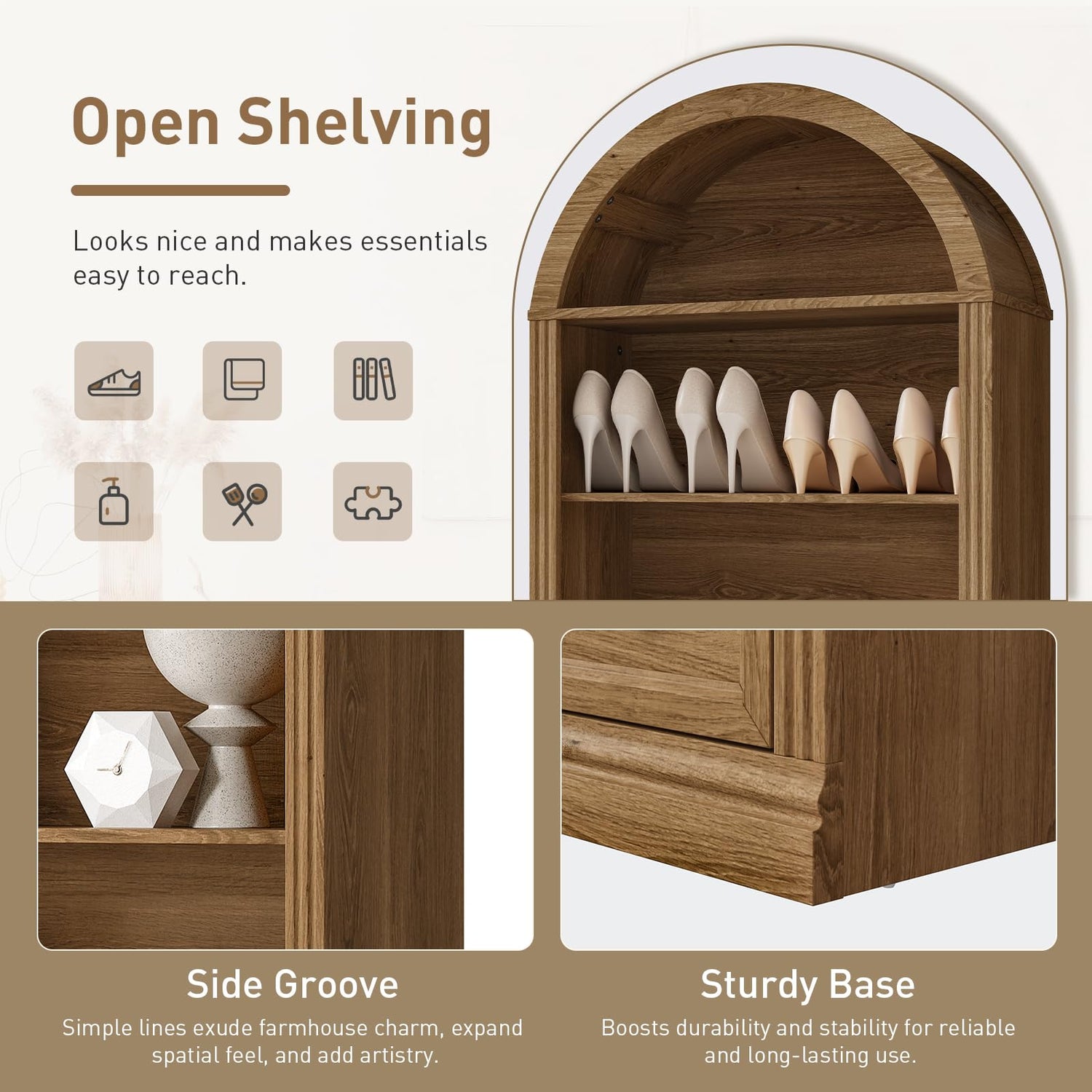 - Easy Assembly: All parts are clearly labeled. Just use the included tools and follow the illustrated manual step-by-step to assemble it quickly and enjoy the stylish and multifunctional arch cabinet in no time