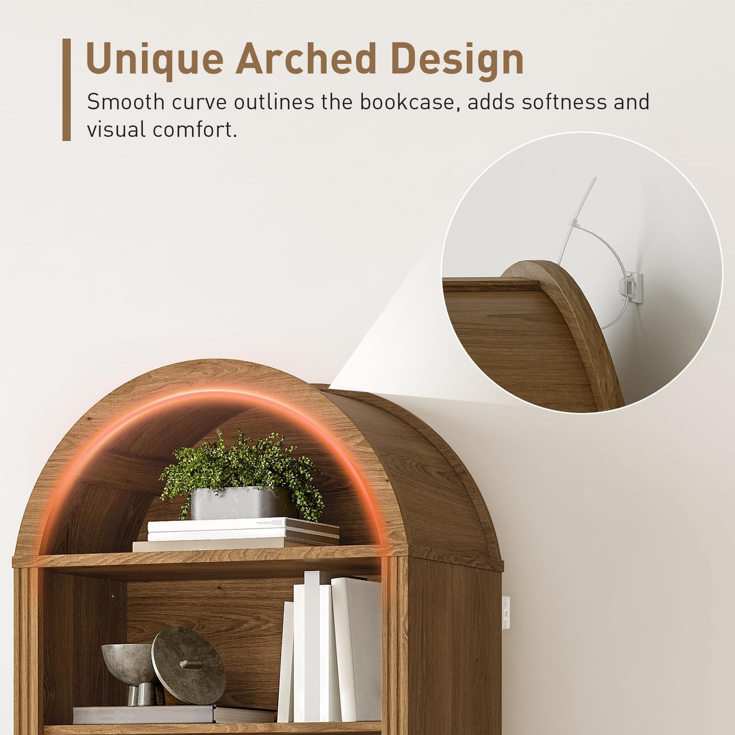 - Sturdy and Safe: Crafted from premium particleboard, the arched bookshelf is built to last, with each shelf supporting a maximum weight of 44 pounds. The heavy-duty base and anti-tip device ensure stability and safety for worry-free storage