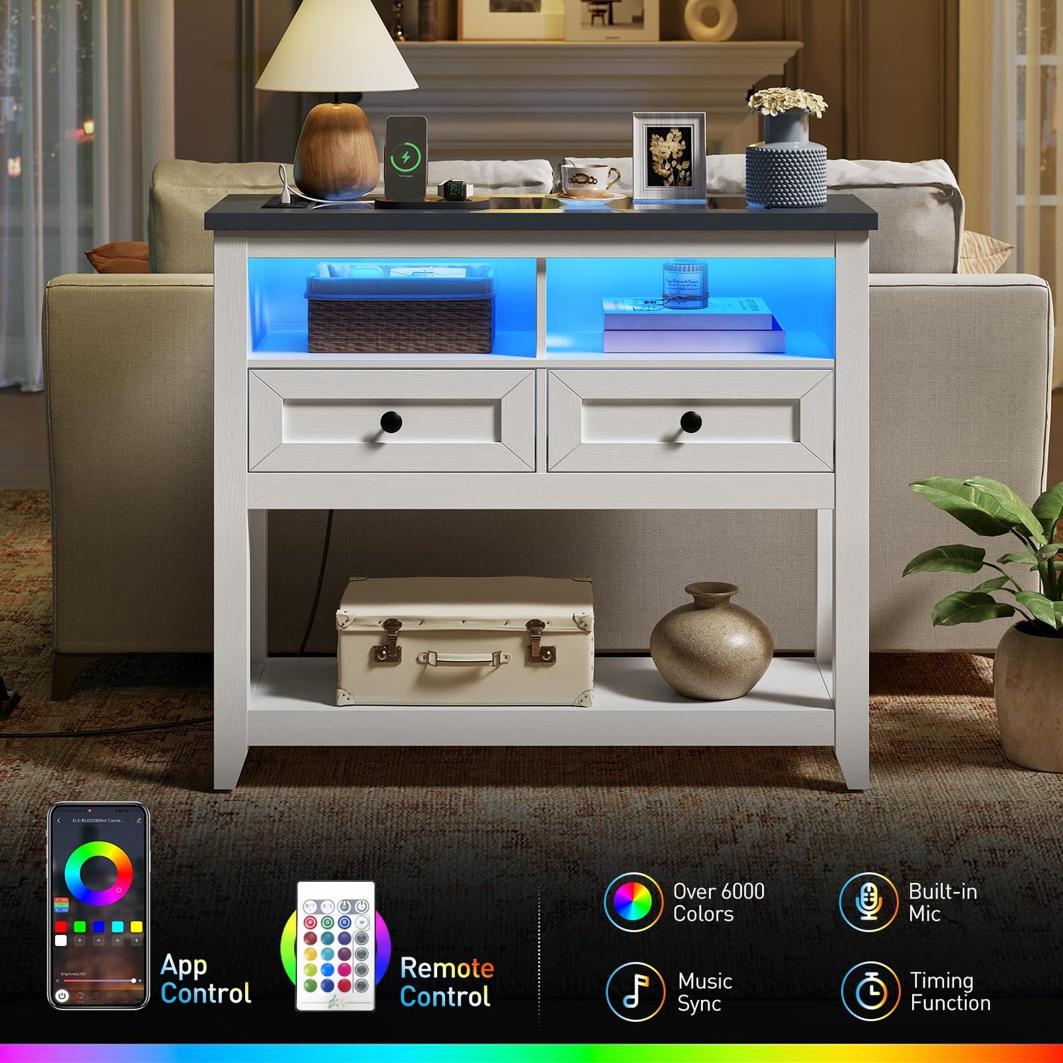 RALGEND Farmhouse Console Table with Charging Station and LED Strip, Entryway Table with 2 Drawers, Sofa Table with Storage, for Entryway, Living Room, Hallway, White and Ink Blue