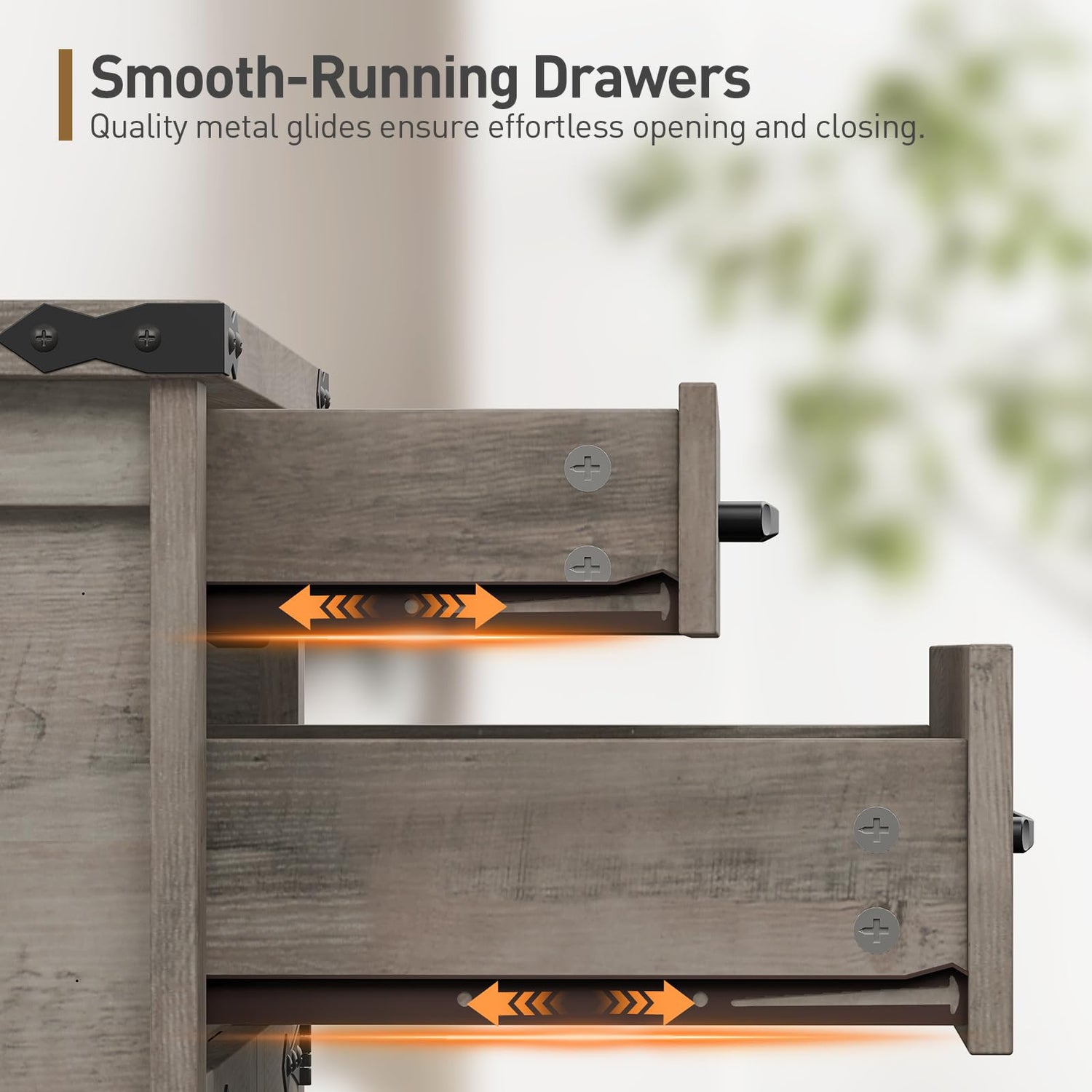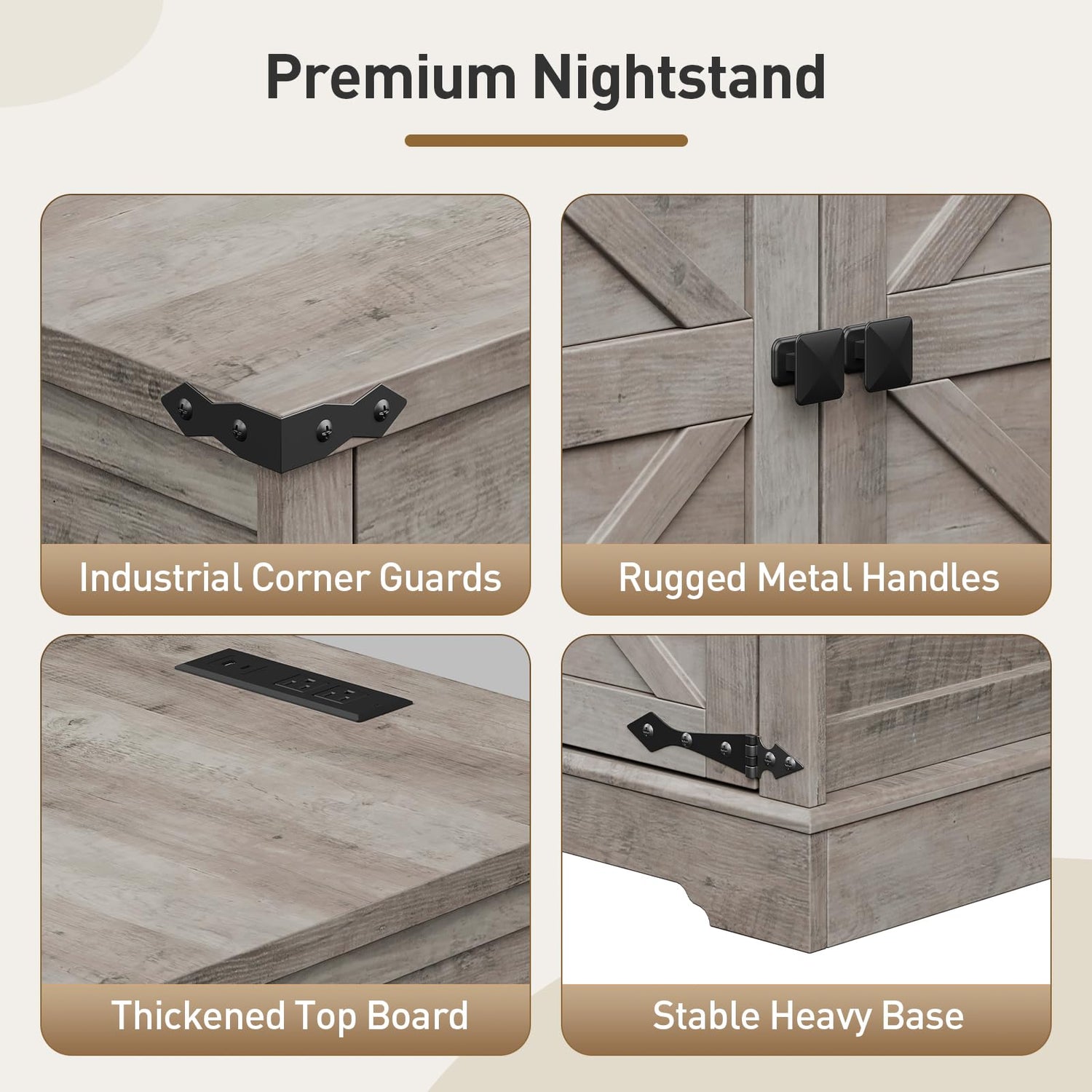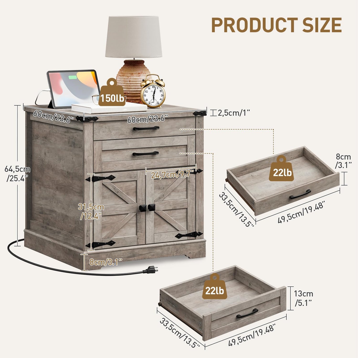 RALGEND Farmhouse End Table with Charging Station, 24'' Sofa Side Table with 2 Drawers and Barn Door, Large Rustic Wooden Square Nightstand for Bedroom, Living Room, Greige
