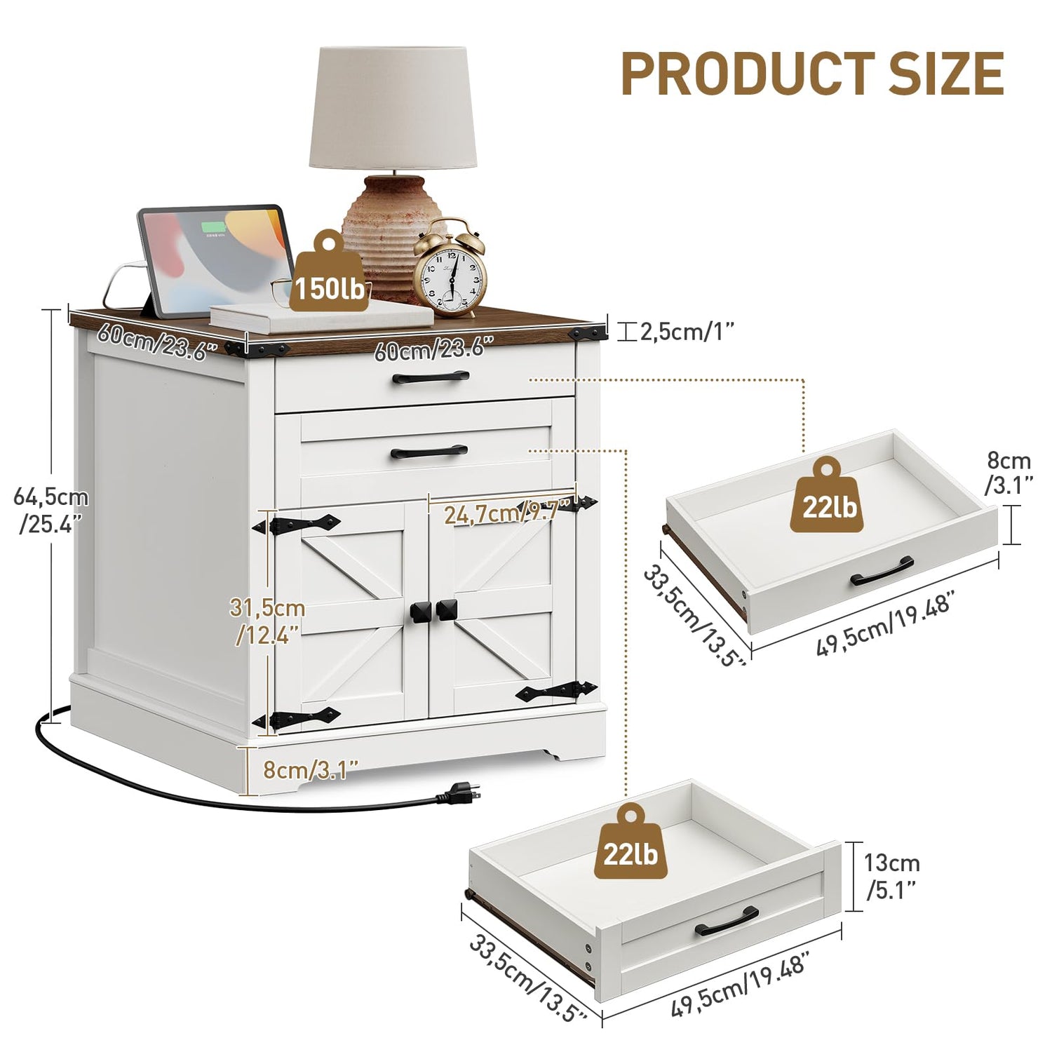 - Large Capacity Storage: This 23.6"L x 23.6"W x 25.4"H farmhouse end table offers a spacious square tabletop perfect for placing lamps and glasses. Two deep drawers provide ample space for bedtime magazines and a cabinet with framed doors for bedside odds and ends