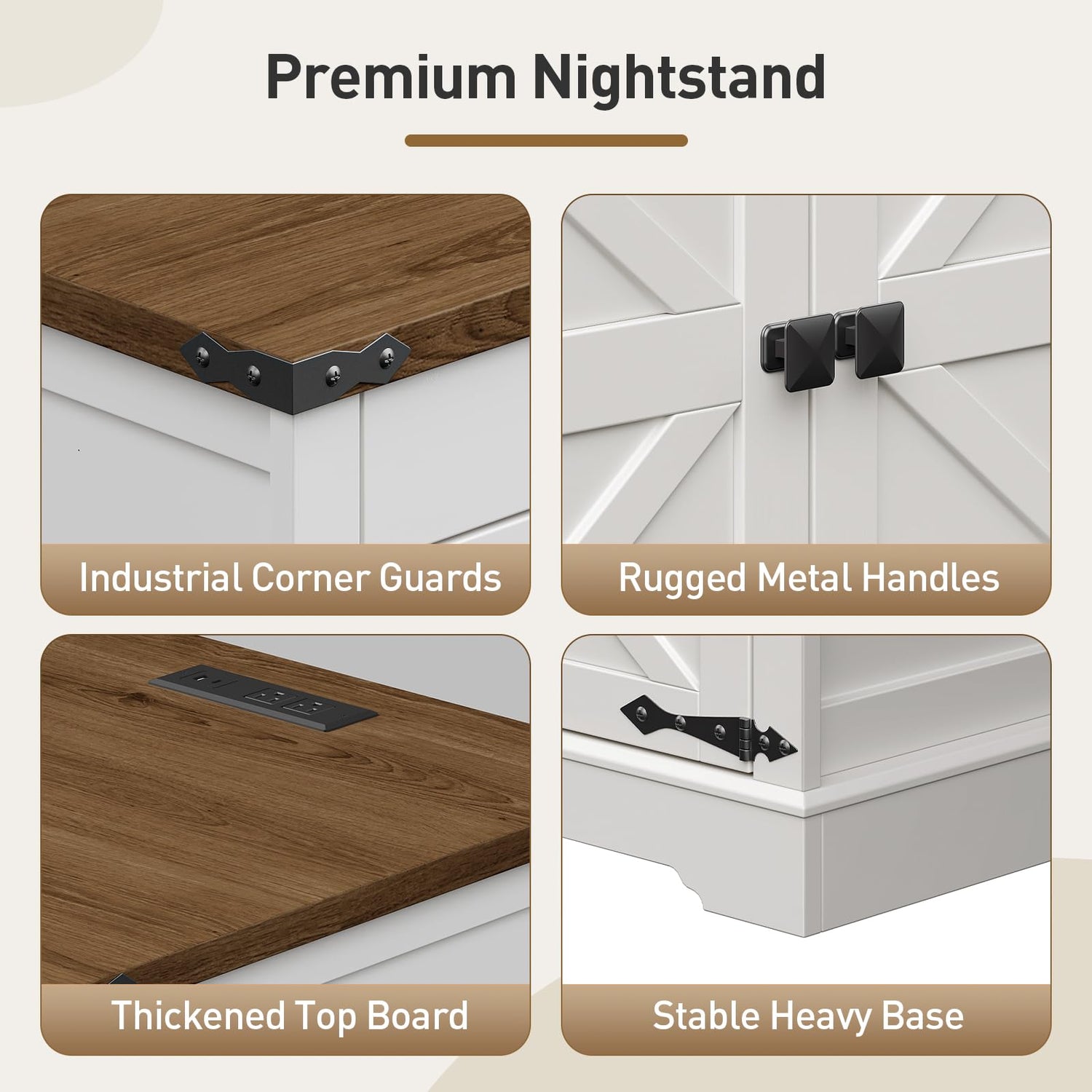 RALGEND Farmhouse End Table with Charging Station, 24'' Sofa Side Table with 2 Drawers and Barn Door, Large Rustic Wooden Square Nightstand for Bedroom, Living Room, White and Walnut