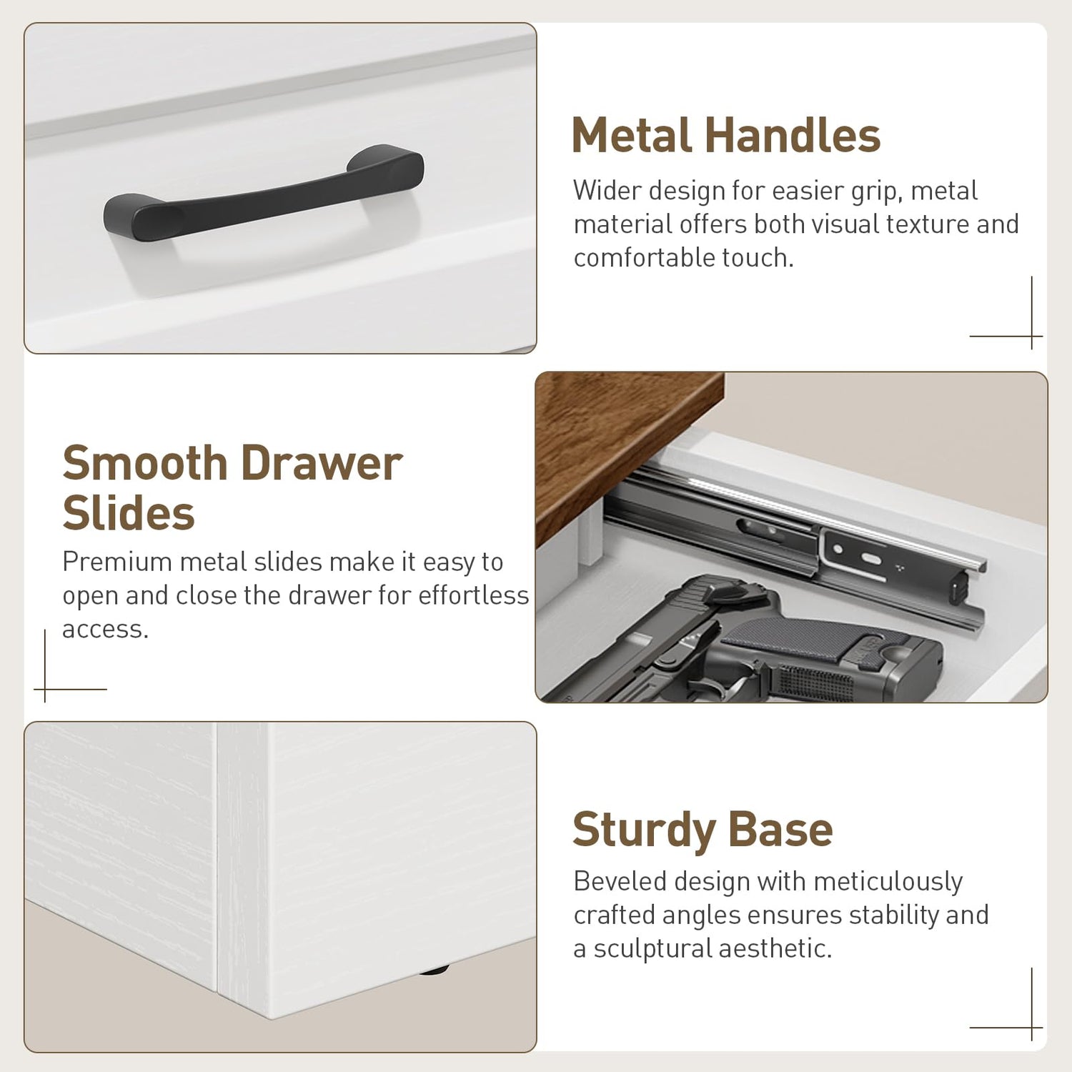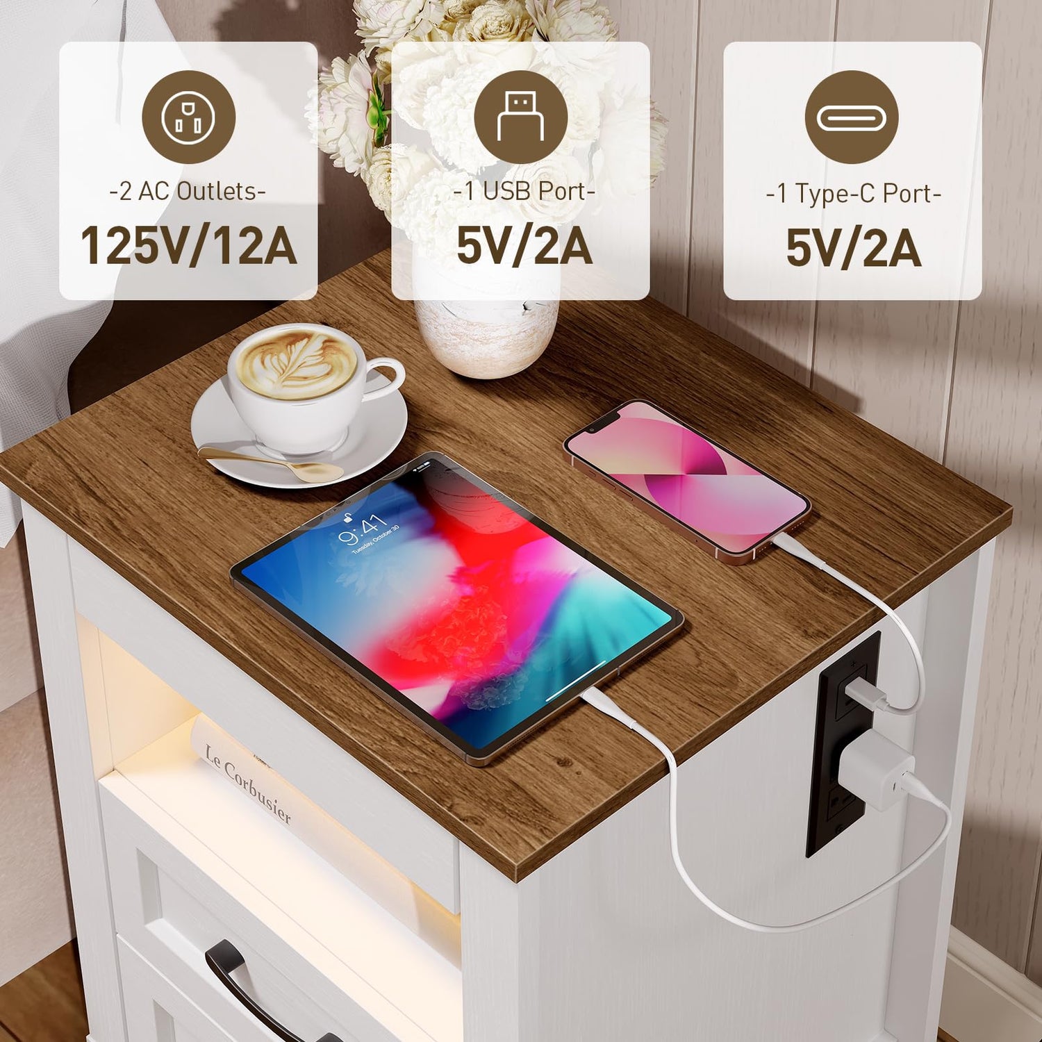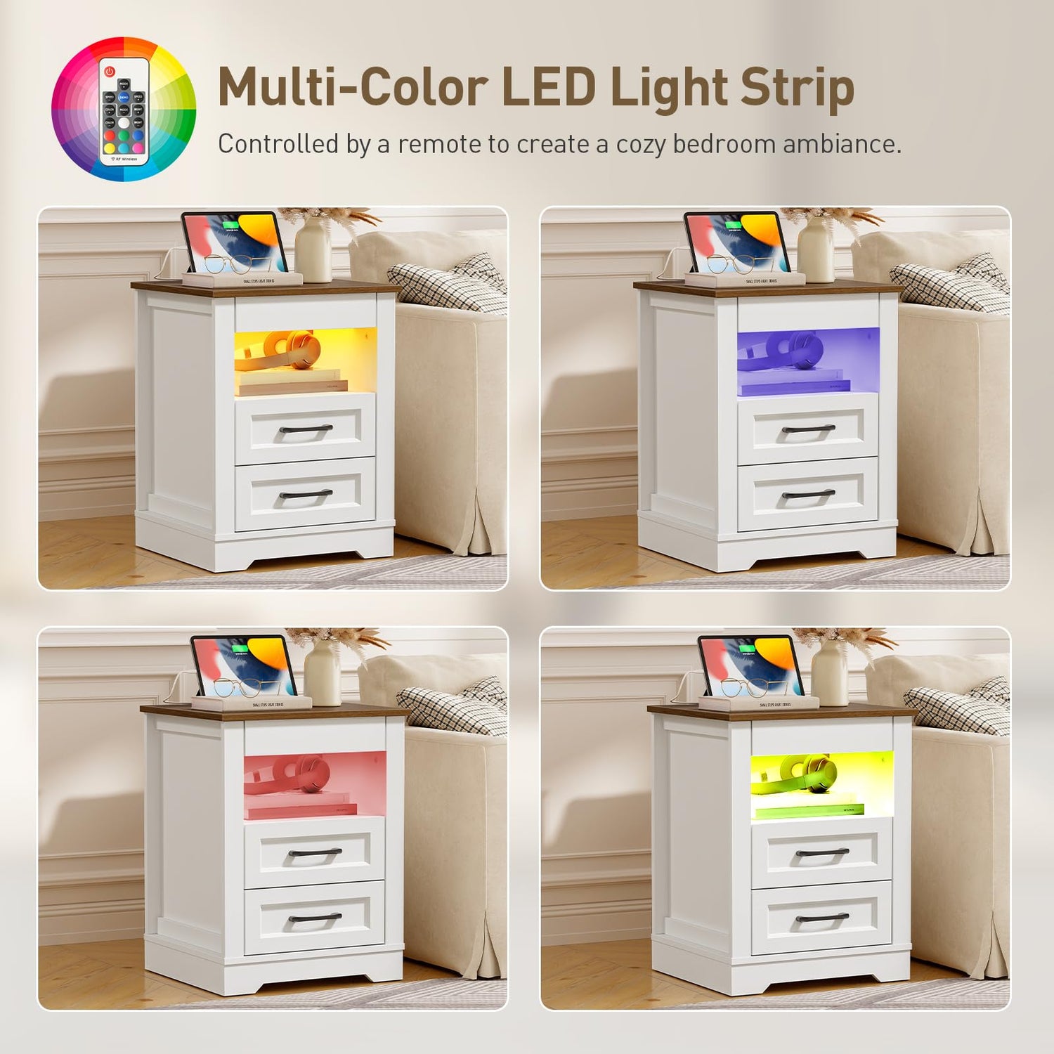 RALGEND Farmhouse Nightstand with Gun Drawer, Bedside Table with Charging Station and LED Light, Night Stand with 3 Drawers, End Table for Bedroom, Living Room, White and Walnut