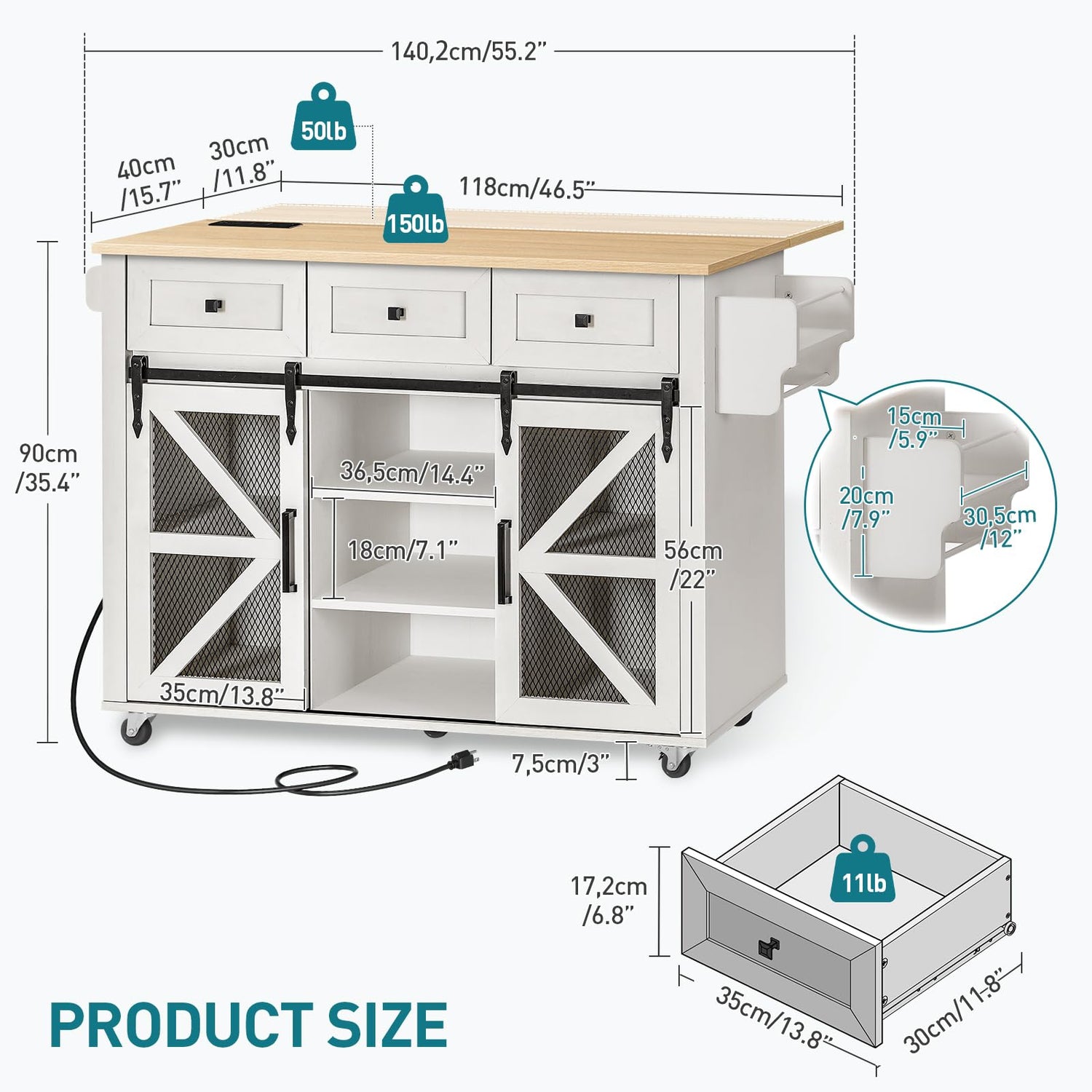 RALGEND Kitchen Island with Storage, Kitchen Cart with Charging Station, Rolling Kitchen Island Table with Drop-Leaf, 3 Drawers, Barn Doors, Towel Rack and Spice Rack, White and Natural