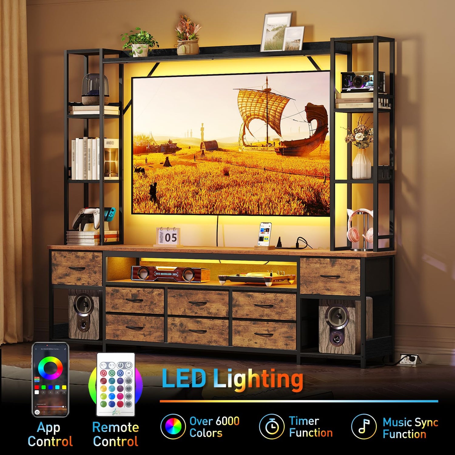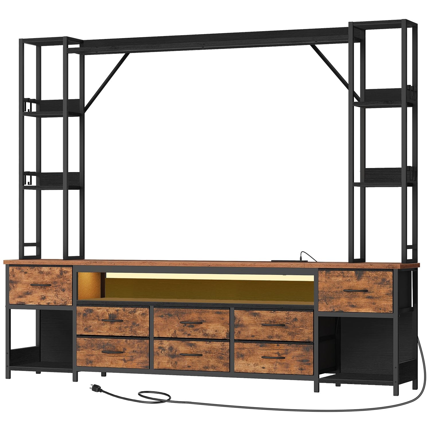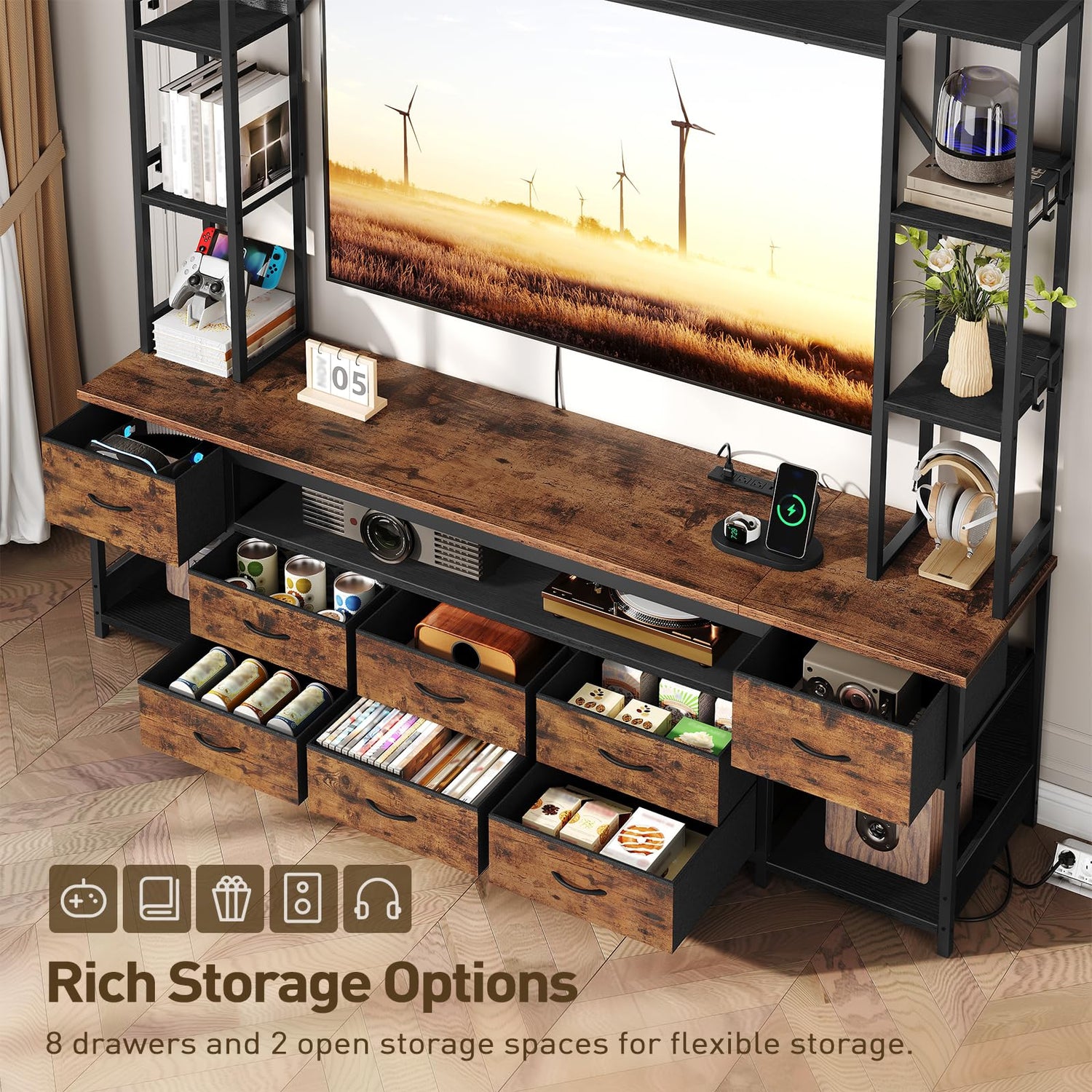 RALGEND TV Stand with Power Outlets to 65 Inches, LED Large Wall Unit Entertainment Center with Bookshelf, Dresser TV Stand with 8 PU Drawer, for Living Room, Bedroom, Rustic Brown and Black