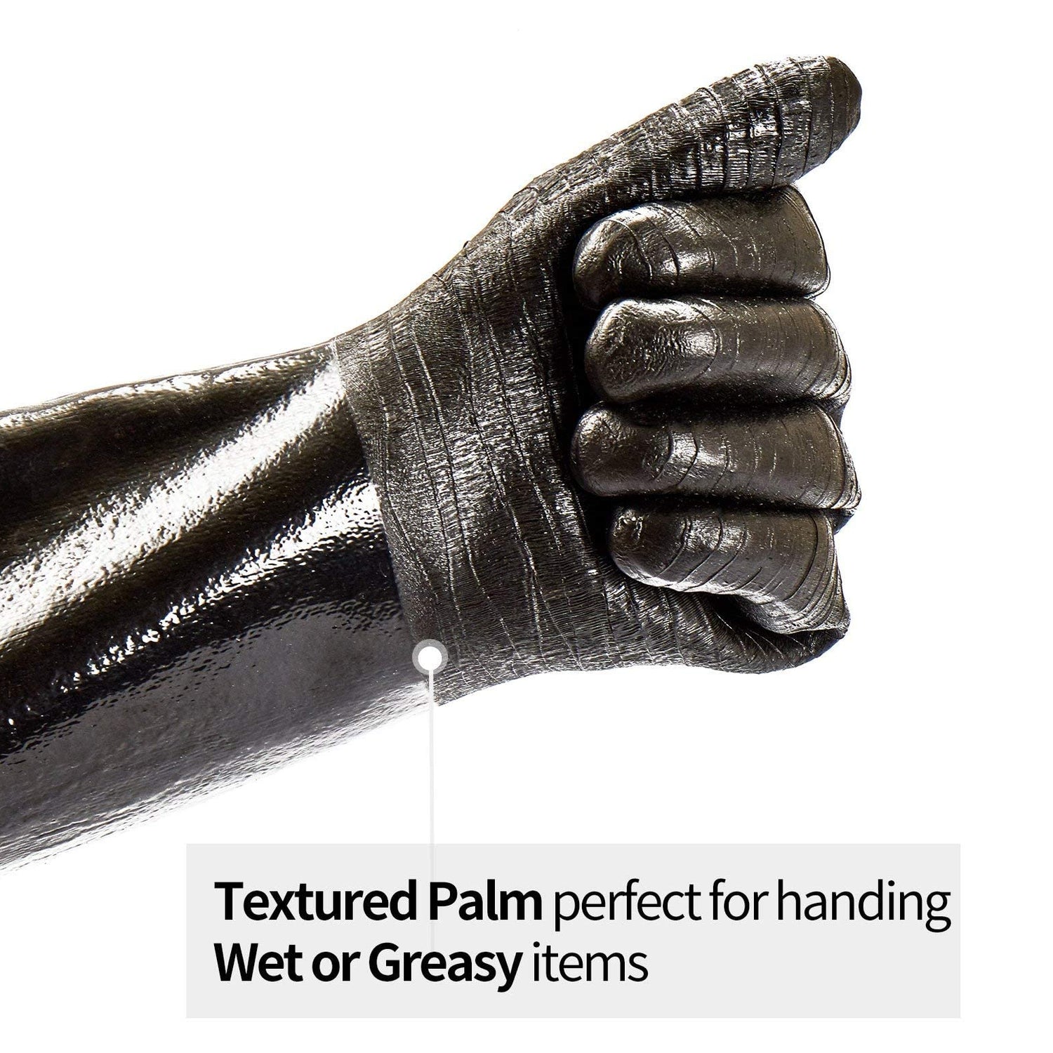 - Excellent Oil & Heat Resistance: Crafted from Food-Grade neoprene rubber, these gloves boast outstanding resistance to water, oil, stains and heat up to 932℉. With a 14-inch sleeve, they provide comprehensive protection for both your arms and hands as you perfect your BBQ masterpiece, handle hot meat on your smoker or grill, or undertake tasks like rotisserie chicken or deep-frying turkey.
