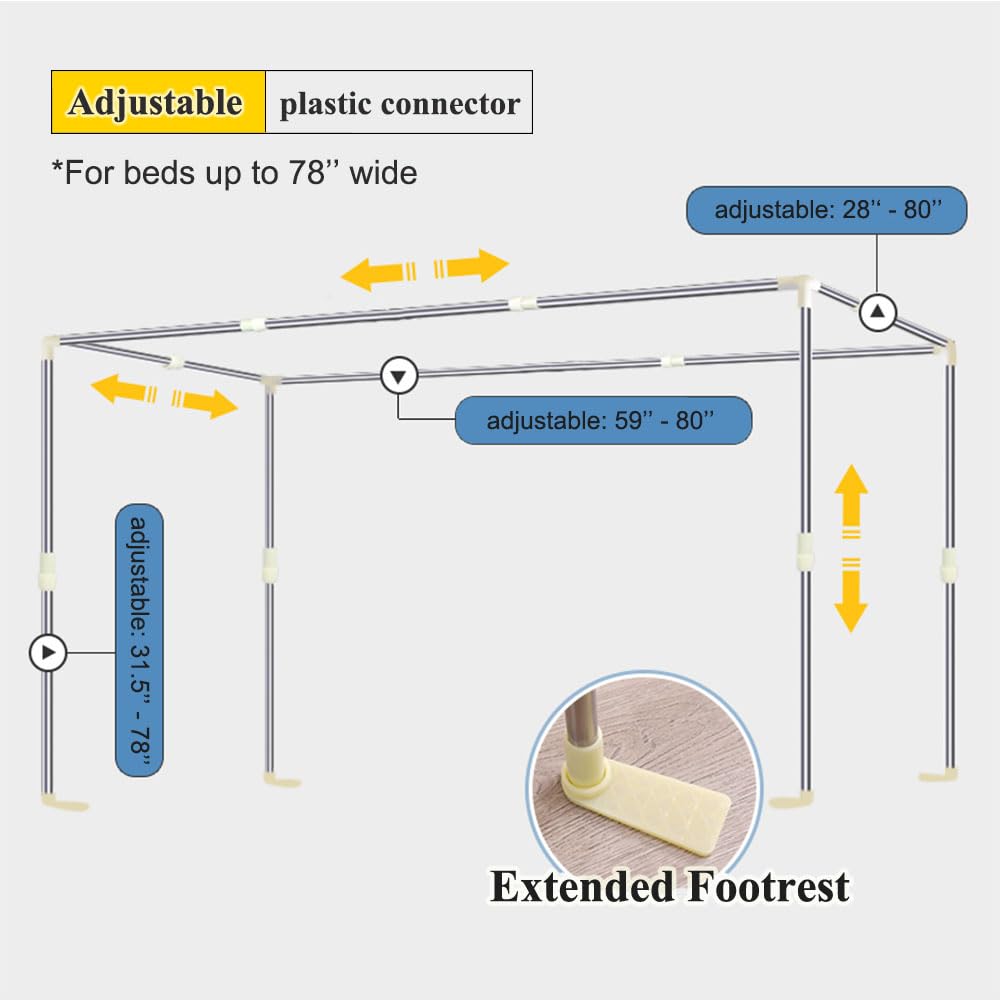 - Adjustable – Our bed canopy poles has 2 sizes to fit various beds, twin, full, queen, king, bunk beds, loft beds and platform beds. The width, length, and height of our canopy frame can be easily adjusted, ensuring a proper fit to your bed.