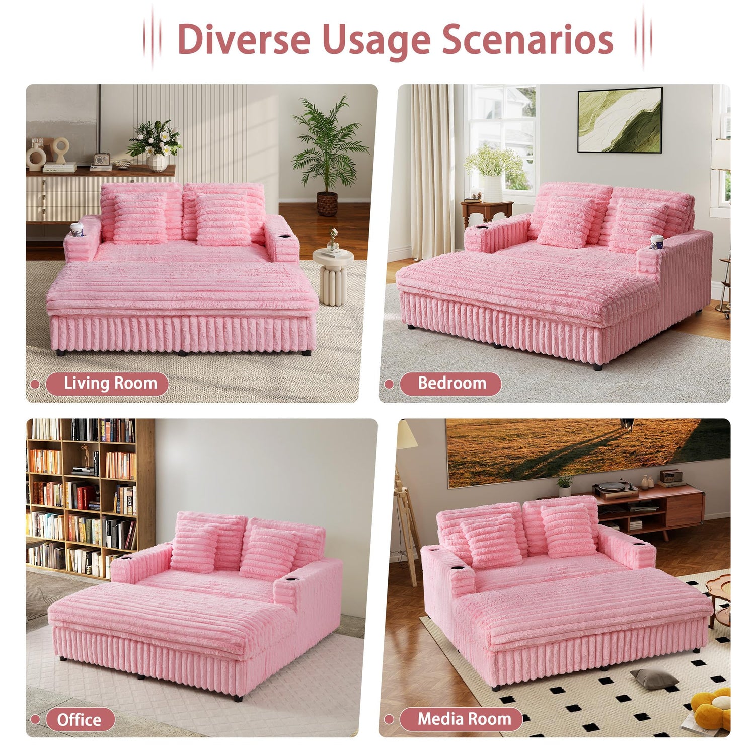 RARZOE 64'' Oversized Chaise Lounge Chair Indoor, Plush Faux Rabbit Fur Sleeper Sofa Bed with 4 Pillows, Charging Station & Cup Holders, Fluffy Comfy Cloud Couch Loveseat Sofa for Living Room,Pink