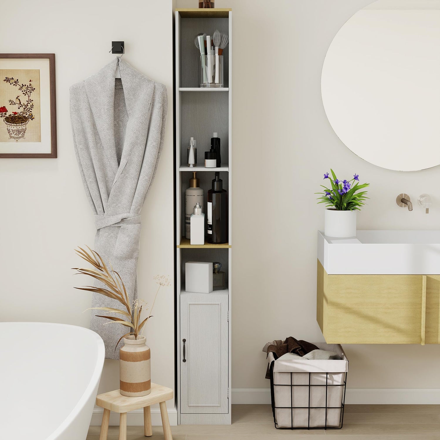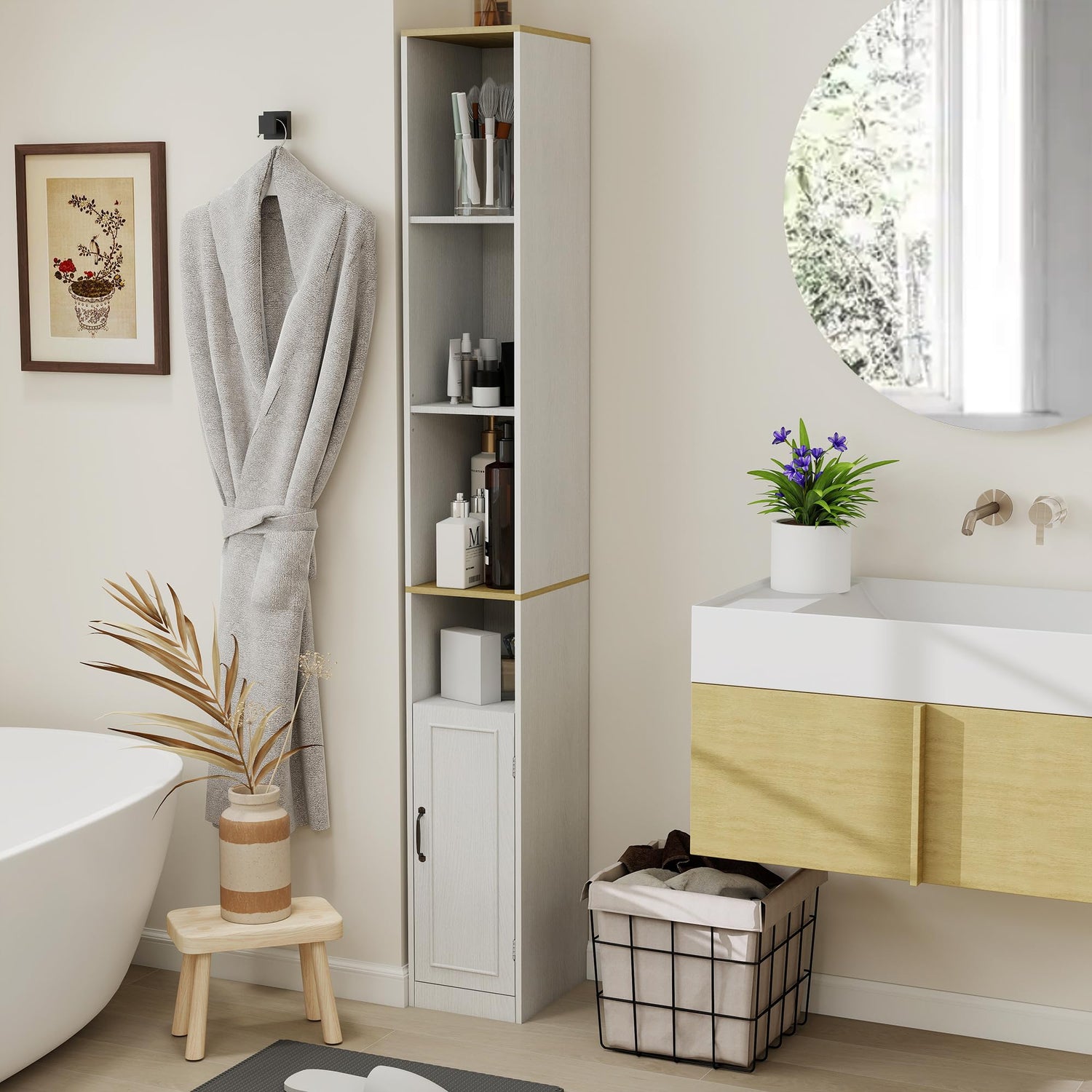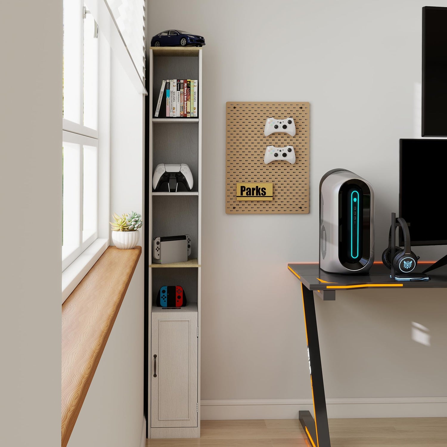 - VERSATILE STORAGE: The narrow design slim bookcase with door for multiple unit combinations to create a personalized collection and display wall. Tall slim cabinet with 4 open shelves and bottom cabinet door, perfect for bathroom supplies, CDs, DVDs, books, or media storage, picture frames, and potted plants, keeping your area organized and accessible