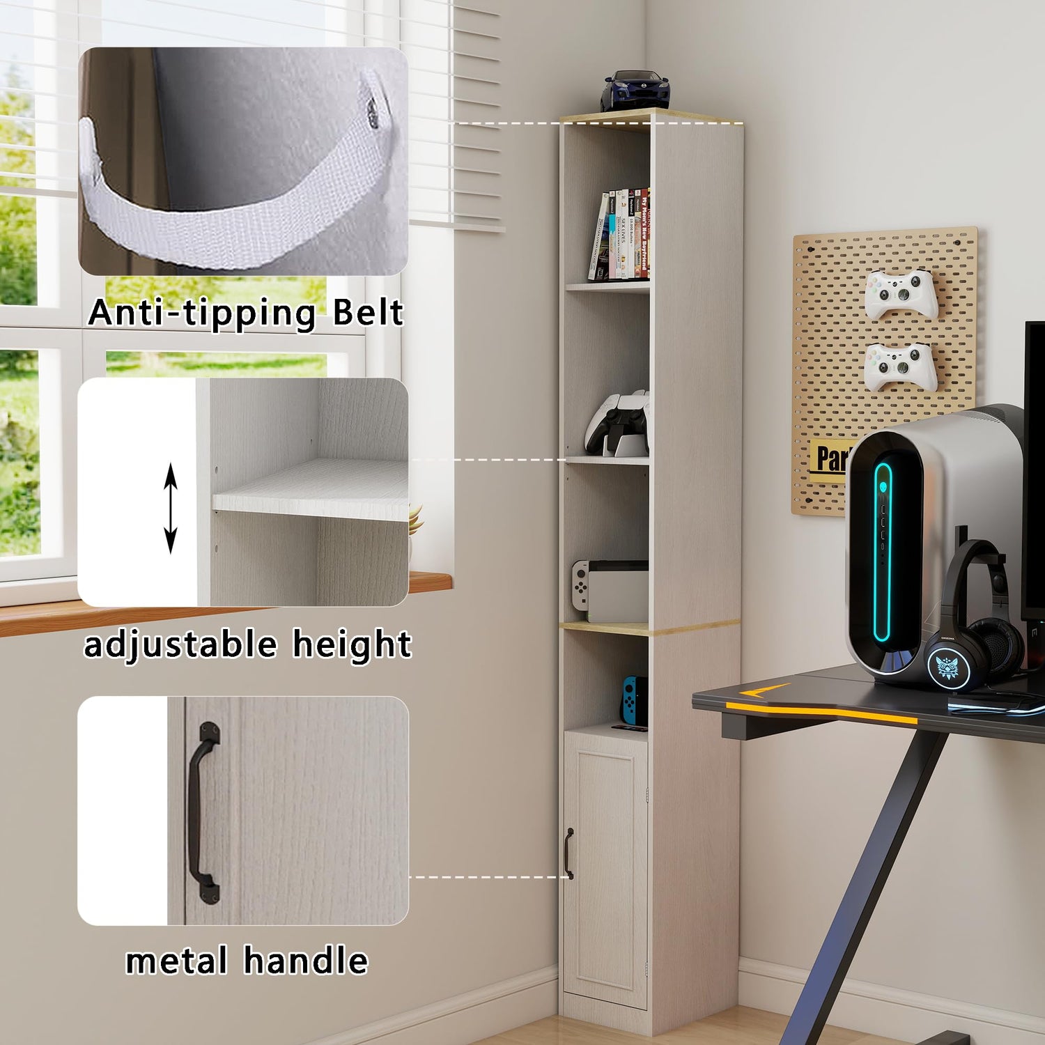 - ADJUSTABLE DESIGN: The tall slim bookshelf features 2 adjustable shelves of and height options for customizable storage space, with a secure anti-tipping belt for safety,Convenient open shelf design with bottom cabinet door, allowing quick access to stored items while keeping some items concealed
