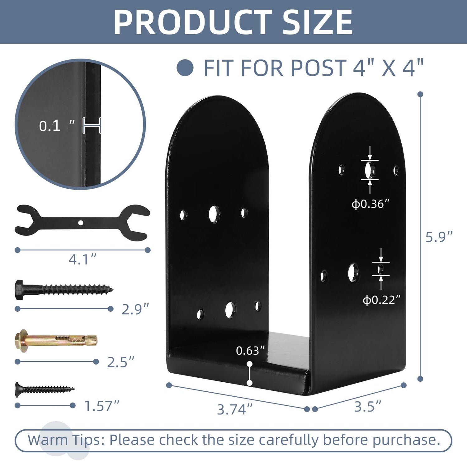 - EASY TO INSTALL: Each adjustable post base bracket has several pre-drilled holes, we provide the bolts and self-tapping screws. Please confirm the standard size of 4" x 4" (actual 3.5"x 3.5" on market) the wooden post before you buy it.