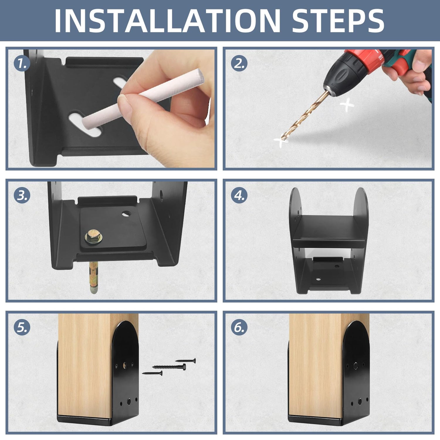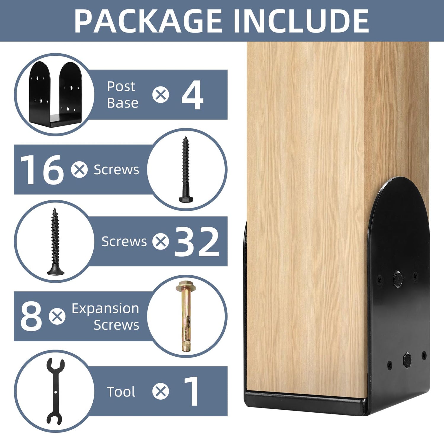 - PACKAGE DETAILS: Package contains 4 pcs 4x4 inches post base brackets(screws included). Not only can it help the wood posts avoid swaying, but also avoiding breakages of the wooden bottom.