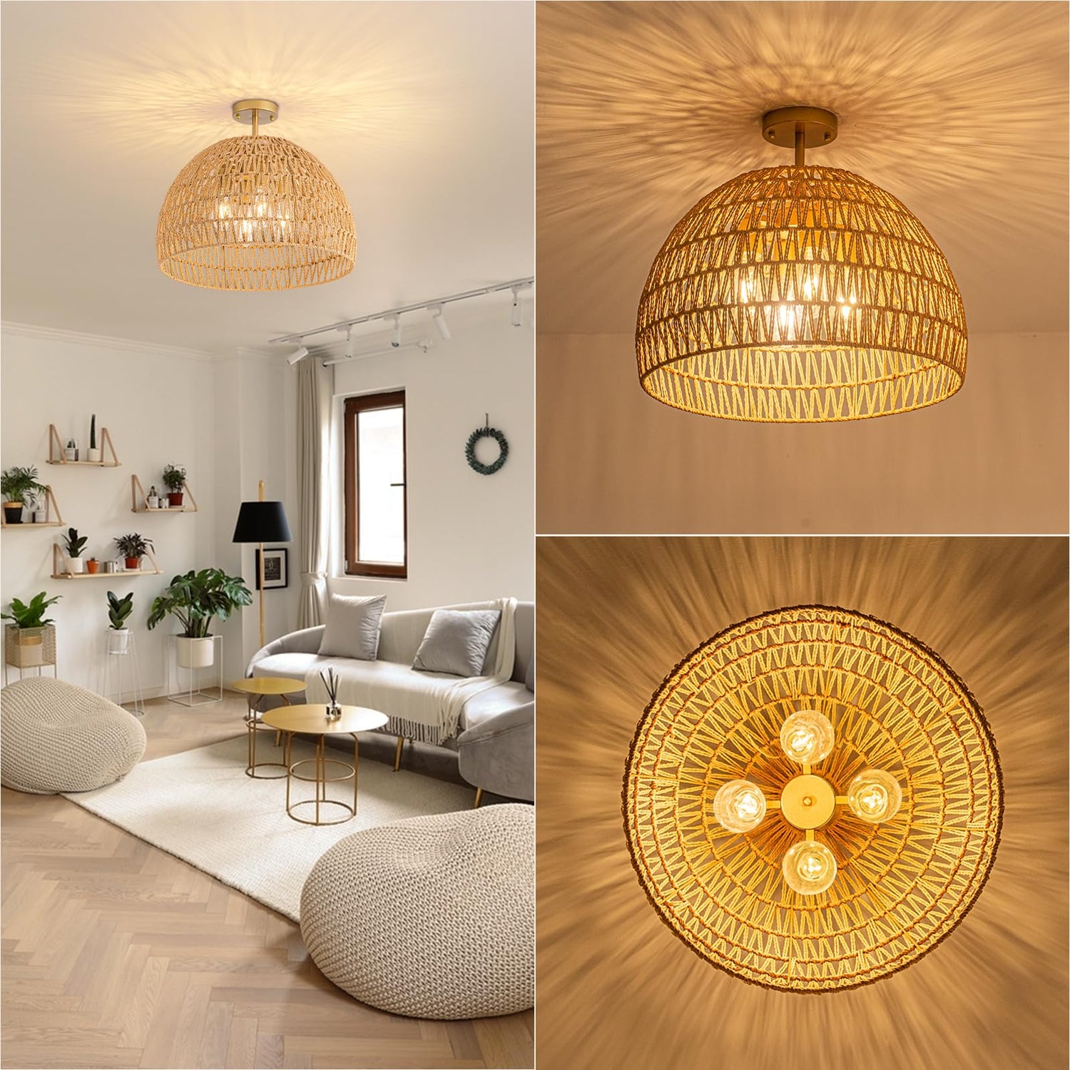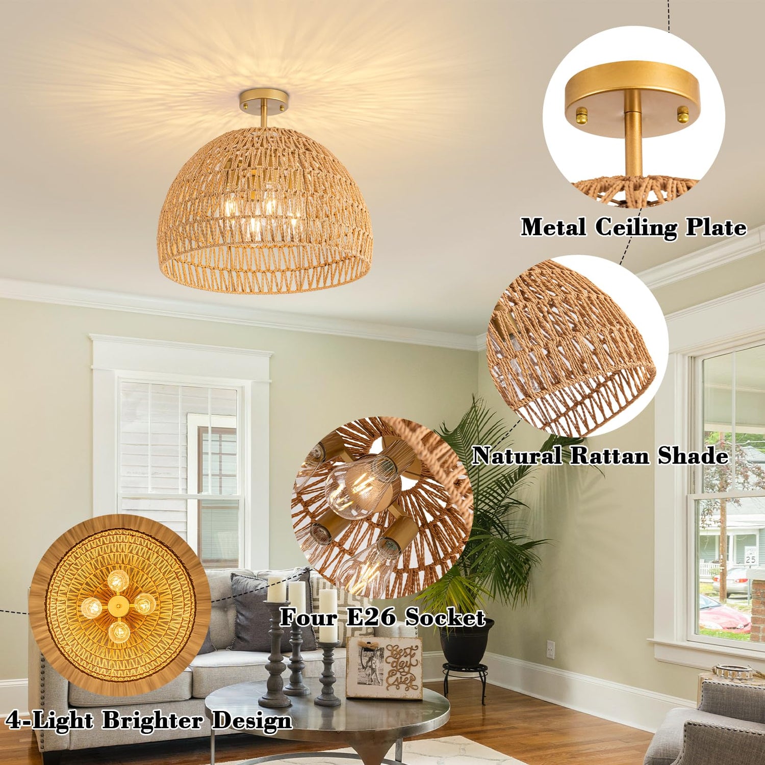 Rattan Ceiling Light Fixture, 4-Light Boho Semi Flush Mount Ceiling Light, 20" Wicker Light Fixture with Handmade Woven Cage Lampshade, Rattan Chandelier for Bedroom Hallway Nursery Kitchen Farmhouse