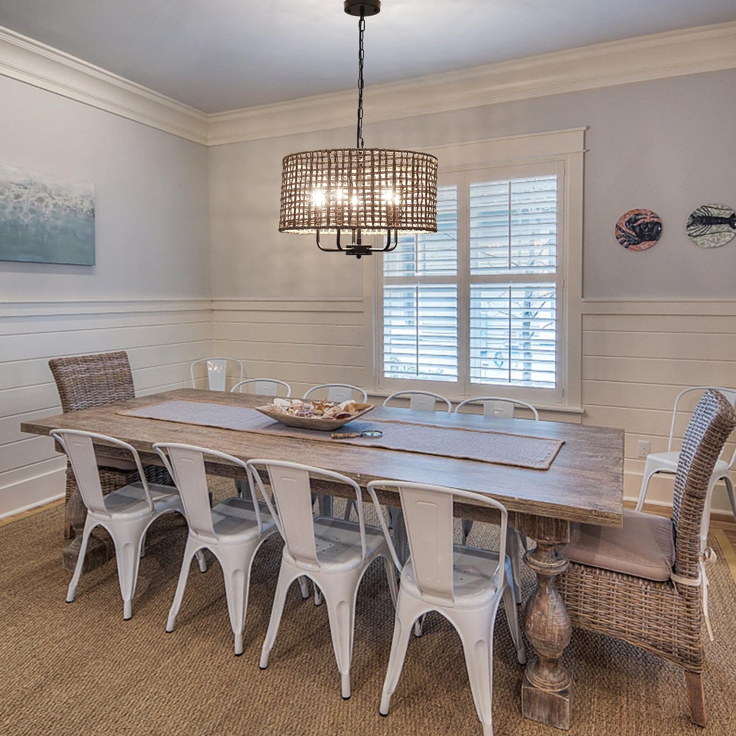 - 💡【5-Light Rattan Light Fixture】 This large rattan black chandelier for dining room chandelier over table is made of hand-woven natural rattan in drum round shade with metal frame, anti-oxidant, more safety and non-fading. The hollow design of the hanging light fixture enables to emit 360° beautiful light shadow, creating a bohemian atmosphere. The wicker chandelier light fixture would become focus in the house, warm and beautiful.