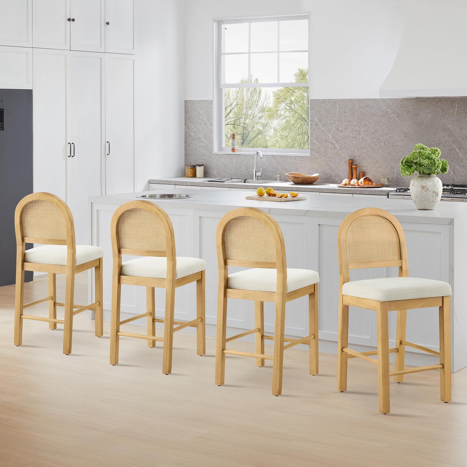 Rattan Counter Height Bar Stools Set of 2, Upholstered Farmhouse Barstools with Natural Rattan Back, Wooden Legs for Kitchen Island, Natural/Linen