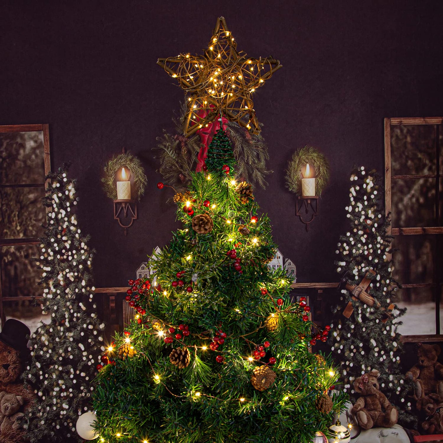- [Christmas Rustic Farmhouse Style] - This Christmas 5-point star tree topper is made of natural rattan handmade, with 50 warm yellow LED lights, easy to light up your Christmas spirit!