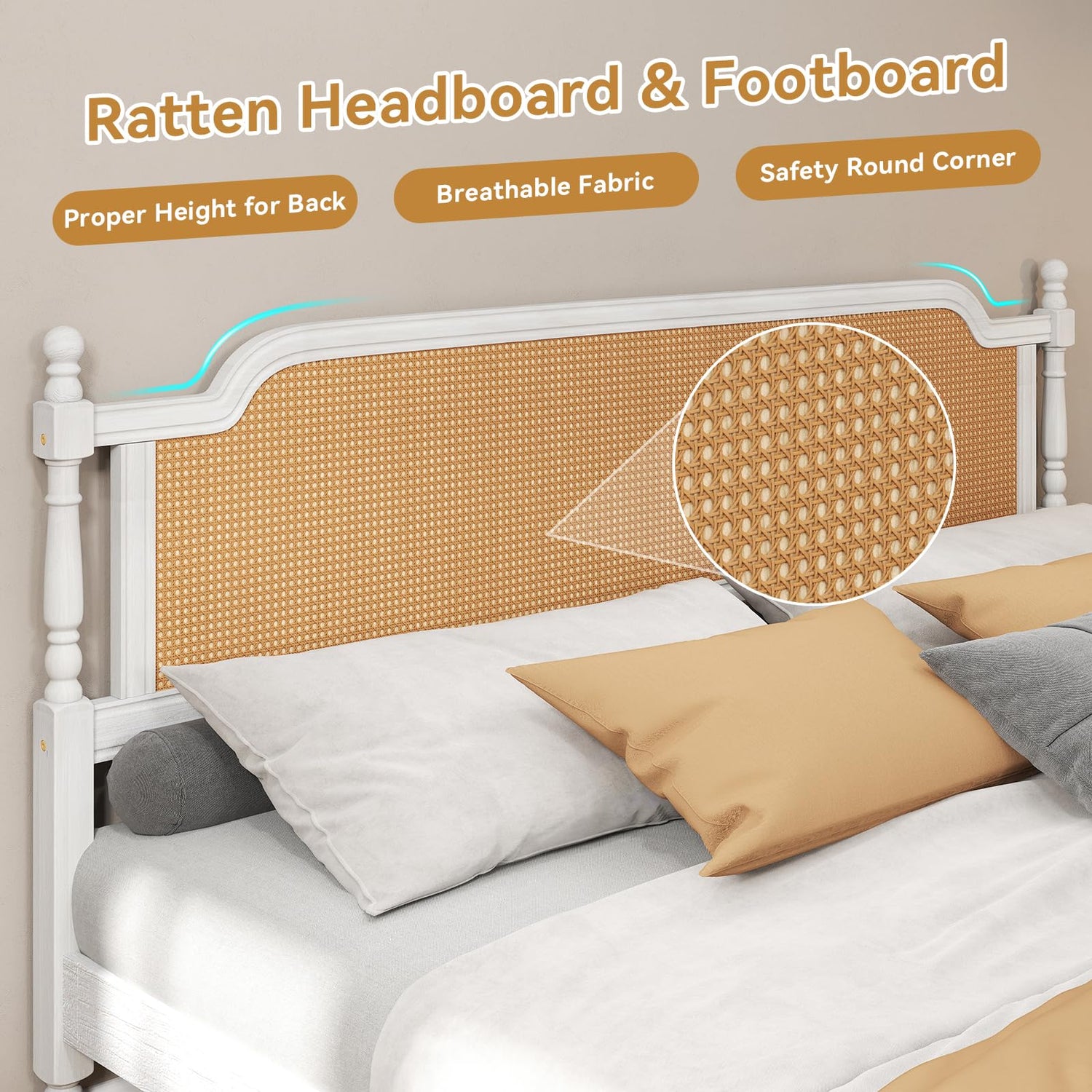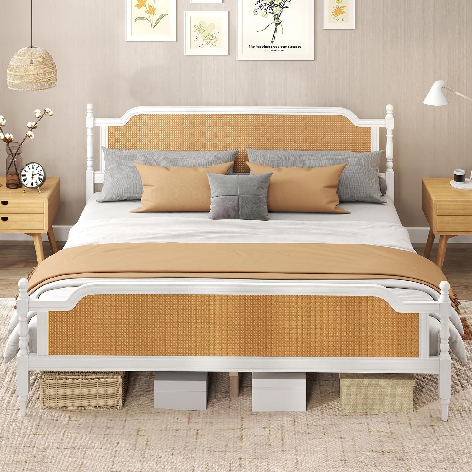 Rattan Queen Bed Frame, Queen Size Platform Bed Frame with Natural Headboard and Footboard, Boho and Mid Century Style, Solid Pine Wood, No Box Spring Needed, Easy Assembly, Antique White/Walnut