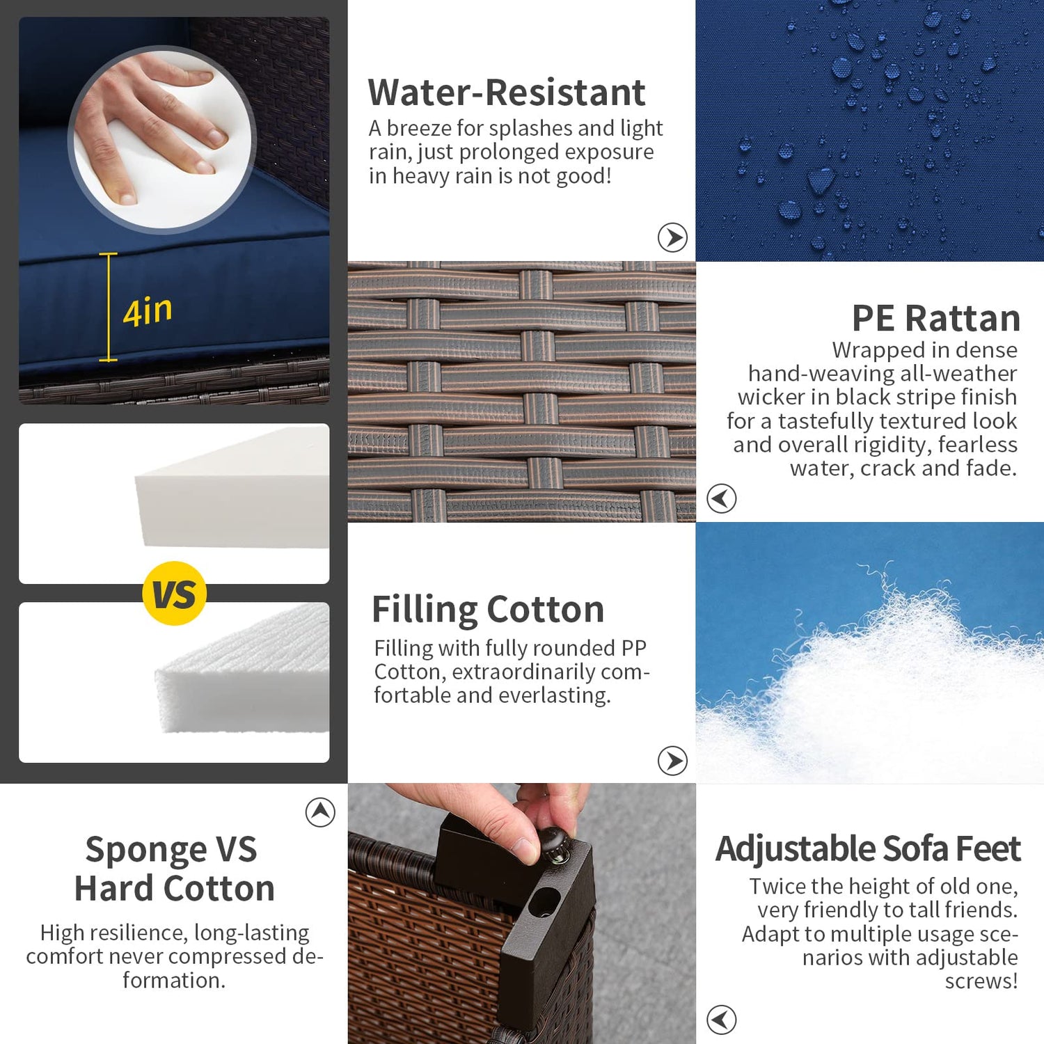 - Comfortable and Non-slip: seat cushions(4 inches) with high resilience sponge and bottom array anti-slip dotted fabric, match up plump back cushions with water-resistant, color retention fabric covers for lasting appeal with outdoor patio furniture, which is extraordinarily comfortable and everlasting