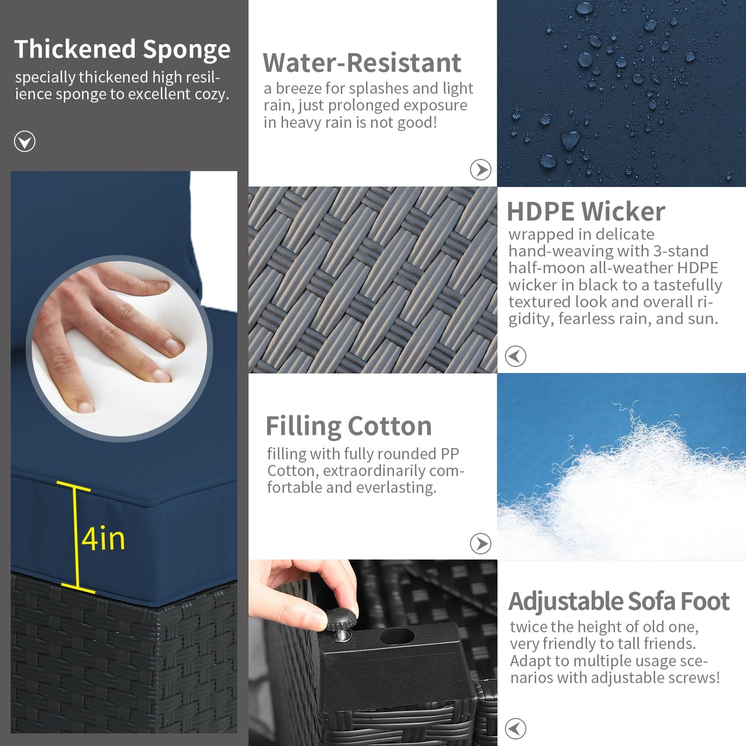 - Comfortable and Non-slip: seat cushions(4 inches) with high resilience sponge and bottom array anti-slip dotted fabric, match up plump back cushions with water-resistant, color retention fabric covers for lasting appeal with outdoor patio furniture set