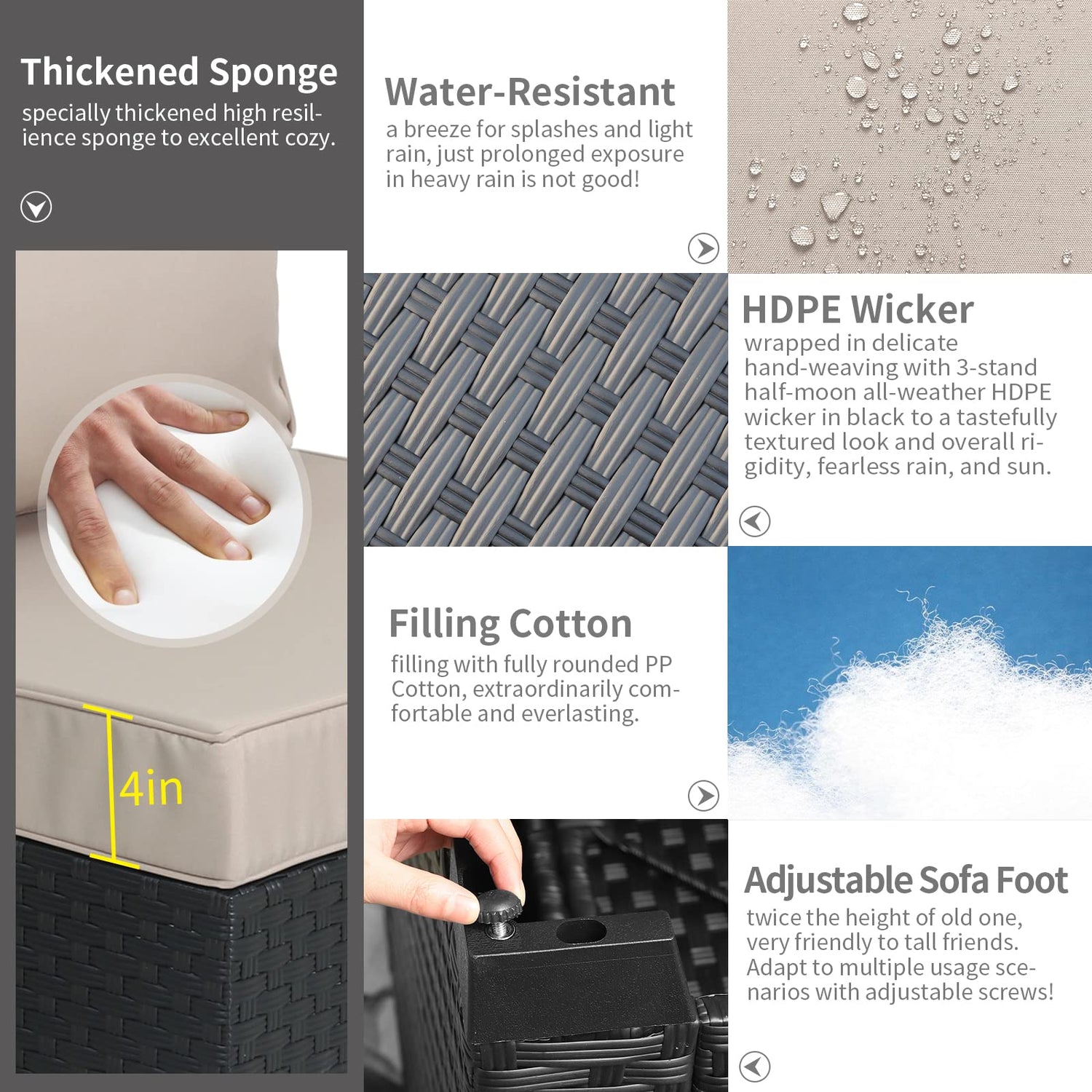 - Comfortable and Non-slip: seat cushions(4 inches) with high resilience sponge and bottom array anti-slip dotted fabric, match up plump back cushions with water-resistant, color retention fabric covers for lasting appeal with outdoor patio furniture