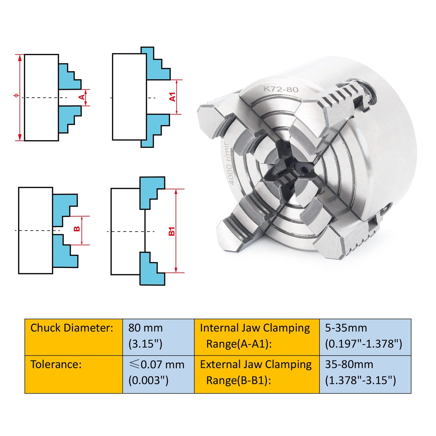 - Chuck Diameter: 80 mm (3.15"); Internal Jaw Clamping Range: 5-35 mm (0.197"-1.378"); External Jaw Clamping Range: 35-80 mm (1.378"-3.15"); Tolerance: ≤0.07 mm (0.003").