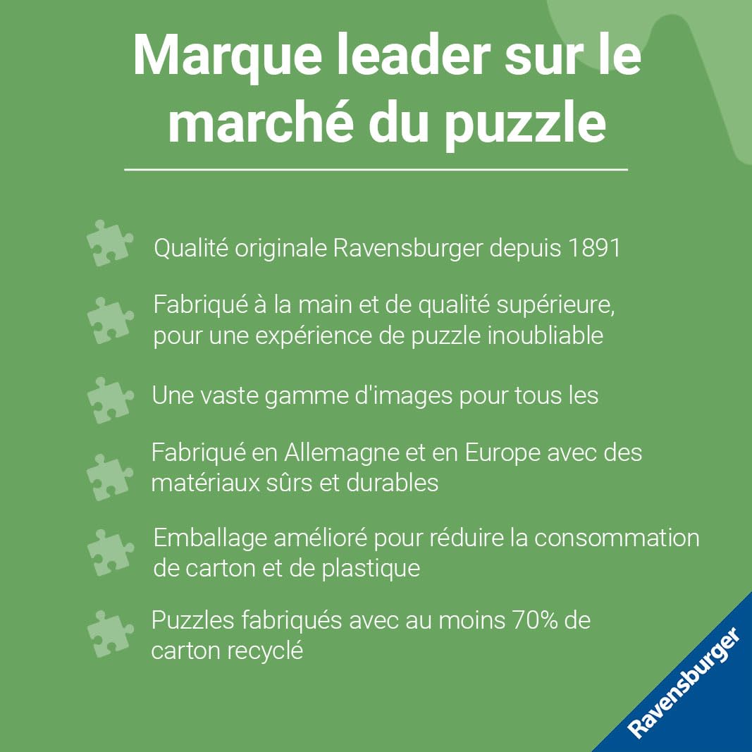 Details: For casual puzzlers and teenagers, the 500 piece format is ideal for enjoying the activity of the puzzle, conducive to relaxation and relaxation. Each piece has a unique shape and allows a perfect assembly of the chosen image. Our puzzles are perfect for relaxing after a day of work or school and for having a great time with the family. The quality of Ravensburger puzzles is recognized and appreciated. Be one of the millions of people who have tasted the playful world of puzzles with quality Ravensburger products. Each puzzle piece has its own shape, so it is unique, and they fit perfectly together.