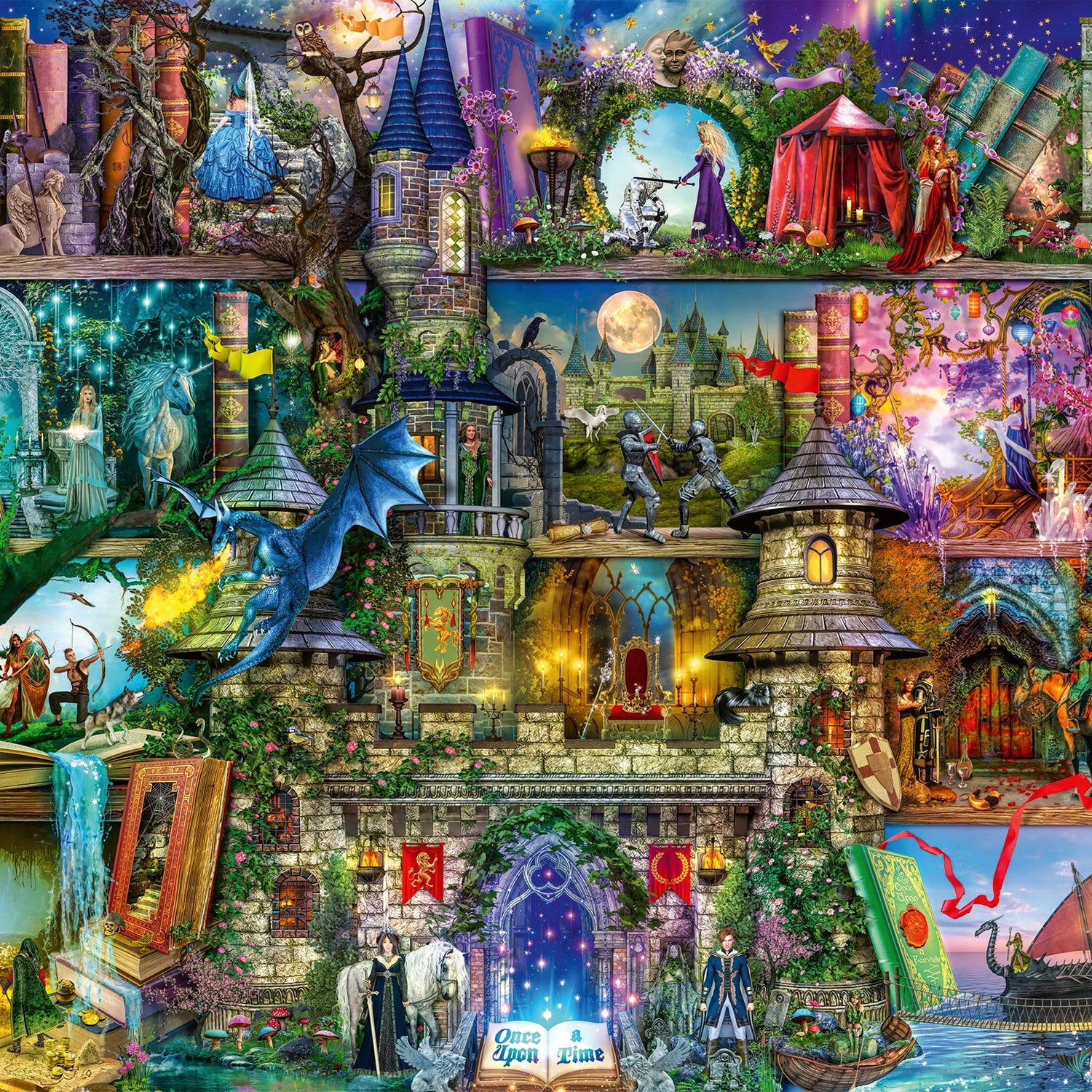 Details: A spectacular Gothic castle towers in front of these crowded bookshelves. Knights, shieldmaidens, lords, ladies, wizards, fairies and mythical creatures portray their spellbinding stories, transporting us across land and sea. Enjoy some mindful moments by escaping into this enchanting jigsaw puzzle! Our 1000 piece jigsaws are crafted with premium quality and measure 70 x 50cm when complete. Great for Adults and ideal puzzles for Children 12 years old and up.
