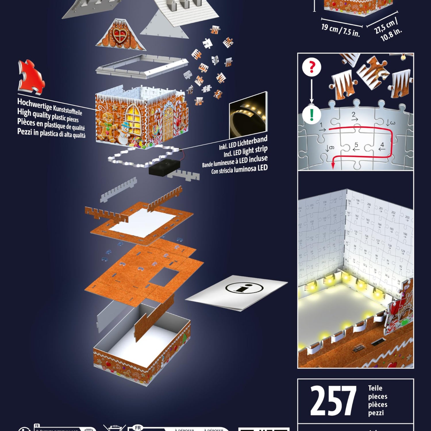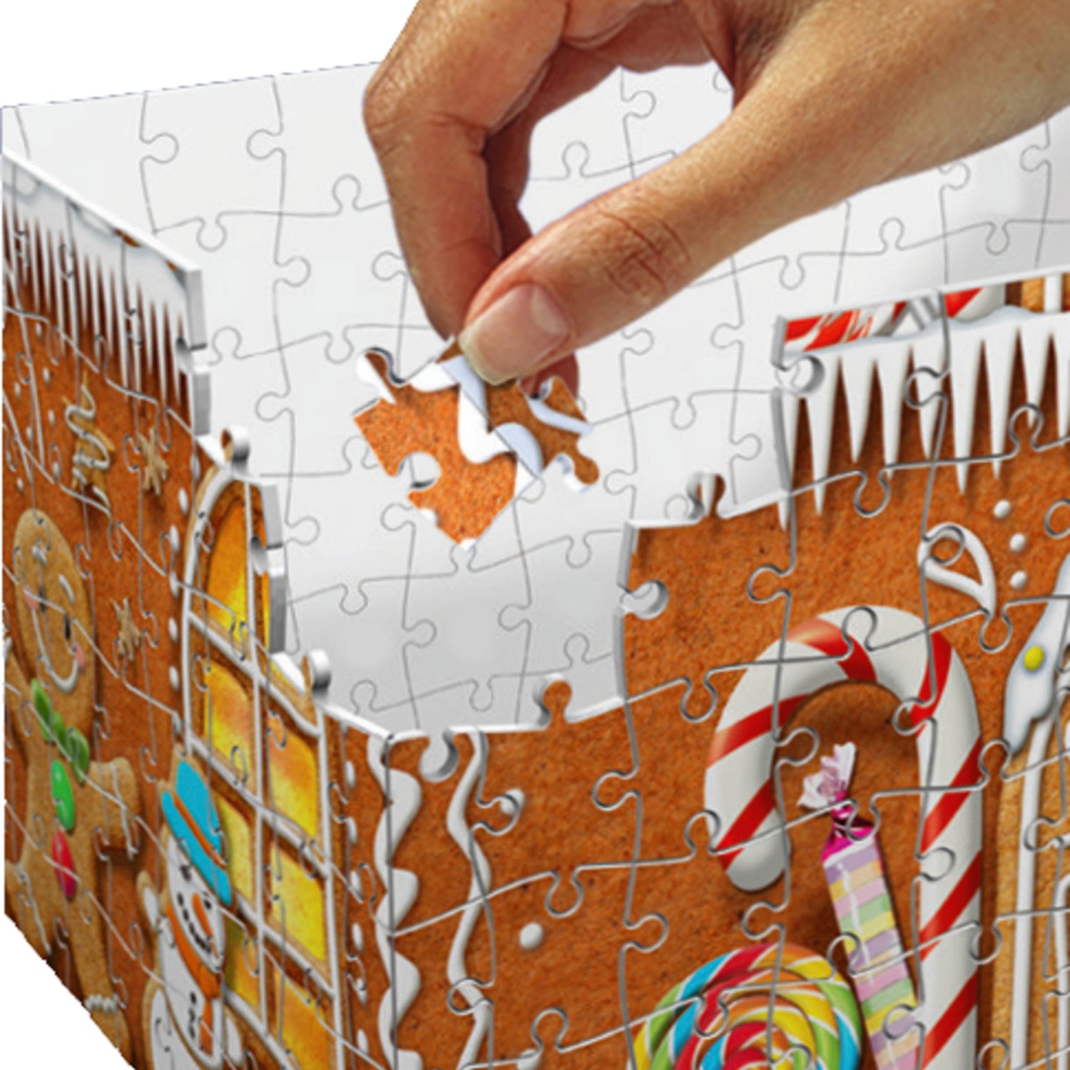 Details: Indulge in some sweet, soothing fun as you create our adorable “Gingerbread House” 3D puzzle, complete with warm LED lights — and zero calories! Bake up a new family tradition without turning the oven on with our light-up “Gingerbread House” 3D puzzle! This puzzle uses unique plastic pieces which slot together to build a strong, sturdy model; no glue required so there’s no mess, fuss or frustration. Each puzzle piece is numbered on the reverse side, so you can assemble the puzzle by eye or simply follow the numbers. After the holidays, just take it apart until next year for lots of repeat fun and a lasting Christmas decoration — sweet! Gather the family for a fun and satisfying holiday activity! This 216-piece 3D puzzle comes with an additional 41 accessory parts and a light module, including LEDs and instructions (3 AAA batteries required). Makes a lovely decoration that’s sure to add a warm glow to your holiday season! From fun family times together to long-term health benefits like stress-reducing, mindful moments, there are so many positives about puzzles! They provide a sense of accomplishment and a great break from your daily grind. And they make a thoughtful birthday or Christmas gift. Create memorable moments with Ravensburger premium puzzles today! Fun for ages 8 and up! Measures approximately 11.5 x 7.5 x 11 inches (29.5 x 19 x 27.5 cm) when completed.