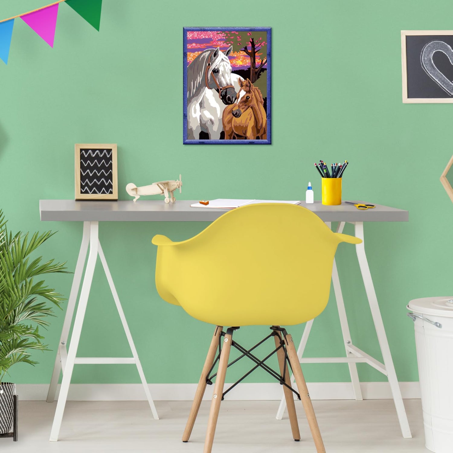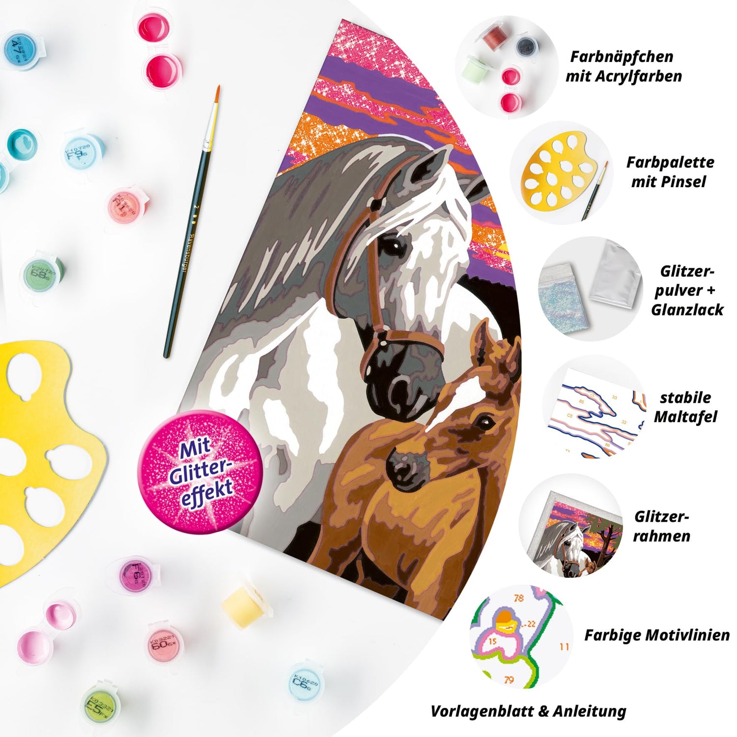 - About this image: Bring a spark of joy to your child as they create this beautiful mare and her foal with our glittering “Sunset Horses” CreArt Painting by Numbers set!