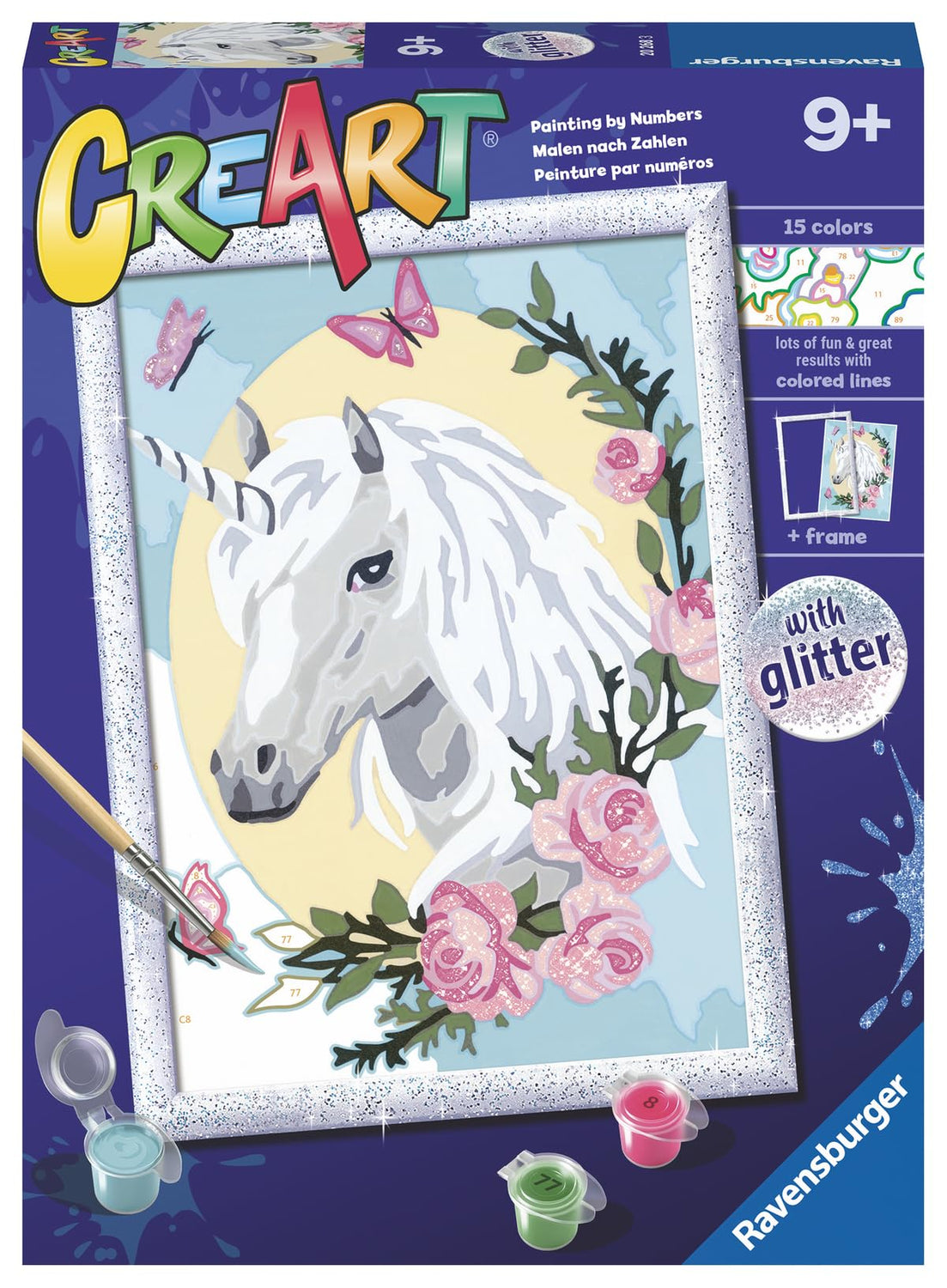 Details: Your child may dream of magical places full of blooms and butterflies as they paint a sparkling “Unicorn Portrait” CreArt Painting by Numbers set! Make magic a part of your child’s day as they create a beautiful “Unicorn Portrait” with this CreArt paint-by-numbers kit! Fun and relaxing, the set comes complete with everything needed to make and display their very own masterpiece, including glitter! Success is simple, with color-outlined sections and matching, odorless paints to ensure picture-perfect results. Finish in about 4 hours, let dry, then use the included glitter frame to proudly display your budding artist’s talent! Looking for a fun activity that keeps your kids off their screens? Help them discover their inner artist with CreArt, our high-quality Painting by Numbers sets! With kid-friendly images designed to match abilities, budding artists can complete a painting in just a few hours. Each section is outlined in its paint color to ensure great results. Painting is a creative activity that may improve dexterity and concentration while providing a sense of satisfaction and relaxing calm! CreArt contains everything children need to create their painting: a high-quality, thick painting board; 15 water-based, opaque acrylic paints in numbered pots; pallet to hold the easy-open/resealable paint pots steady; durable, fine-point paintbrush; easy-to-follow guide sheet; glitter and finish/glue; glitter frame to display their finished artwork. Makes a great gift! Made in Czech Republic.